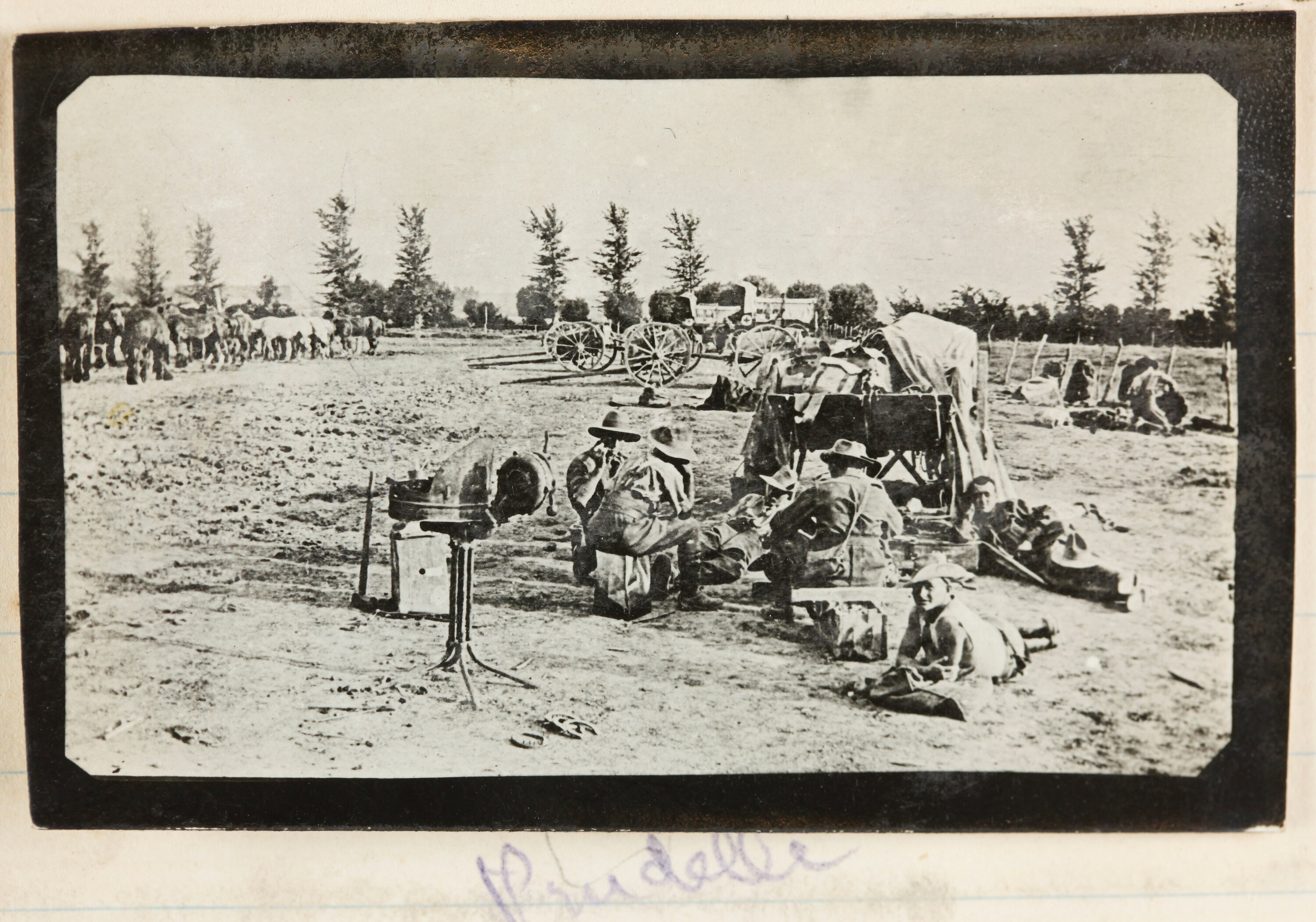 These photographs provide a record of some of the objects and places that John Lord saw in Belgium and France and the places that interested him most. These include Army camps, Chateau, trains, a plane, local people, other soldiers, horses and trucks. From the list of Lord's subjects, we can see that these photographs were taken in 'time off' that is to say, taking photographs took some time and these images depict people and places removed from battle, for example, soldiers photographed beside a Chatéau.
