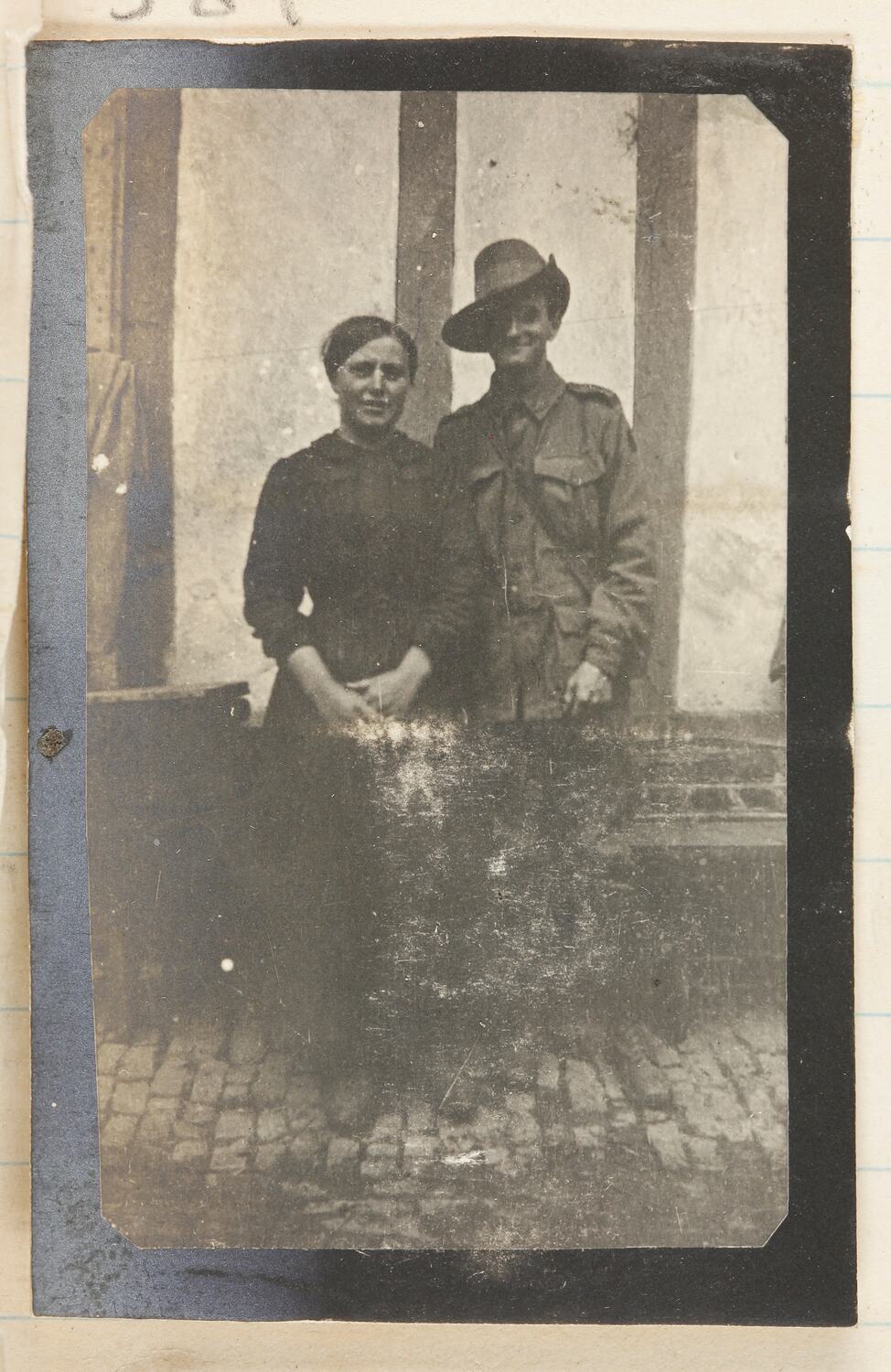 An unidentified woman and soldier standing side by side in front of a building.