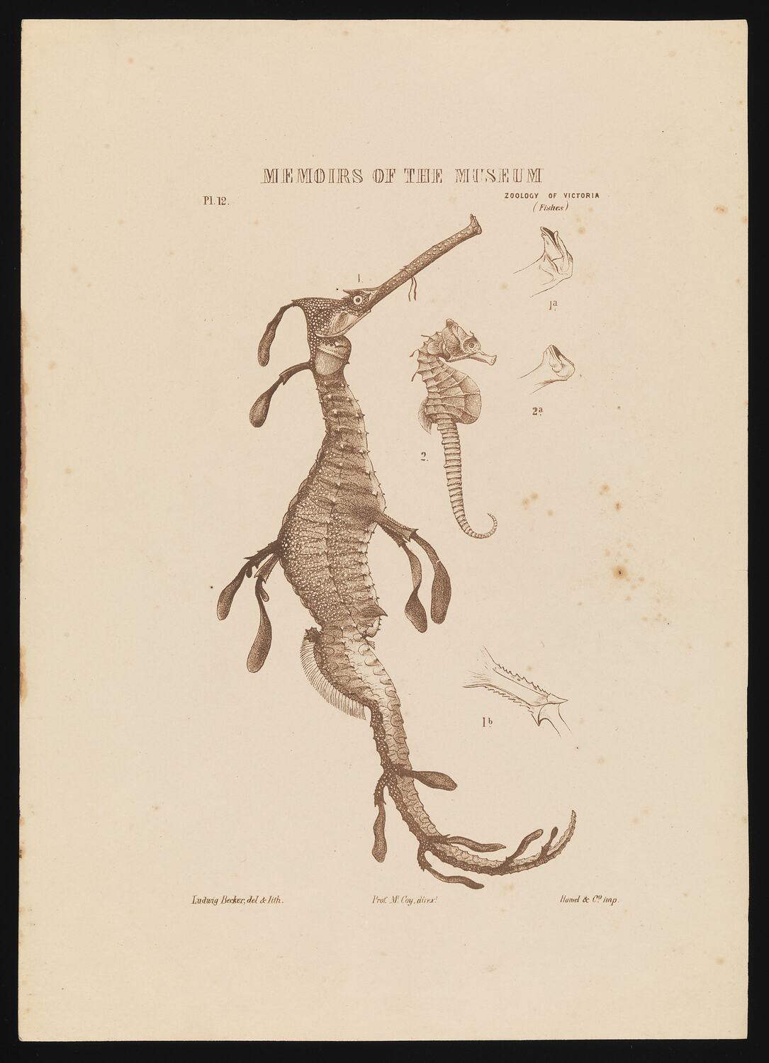 Lithographic proof (single colour brown) of a Common Seadragon, Phyllopteryx taeniolatus, and a Shorthead Seahorse, Hippocampus breviceps, by Ludwig Becker. This work was finally published as Plate 65 in the Prodromus of the Zoology of Victoria by Frederick McCoy.