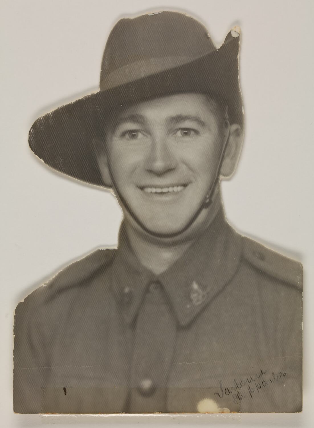 Black and white silver gelatin photograph. The back ground has been cut away from the portrait leaving an outline around the sitter. There is also adhesive tape stuck to the bottom of the photograph.