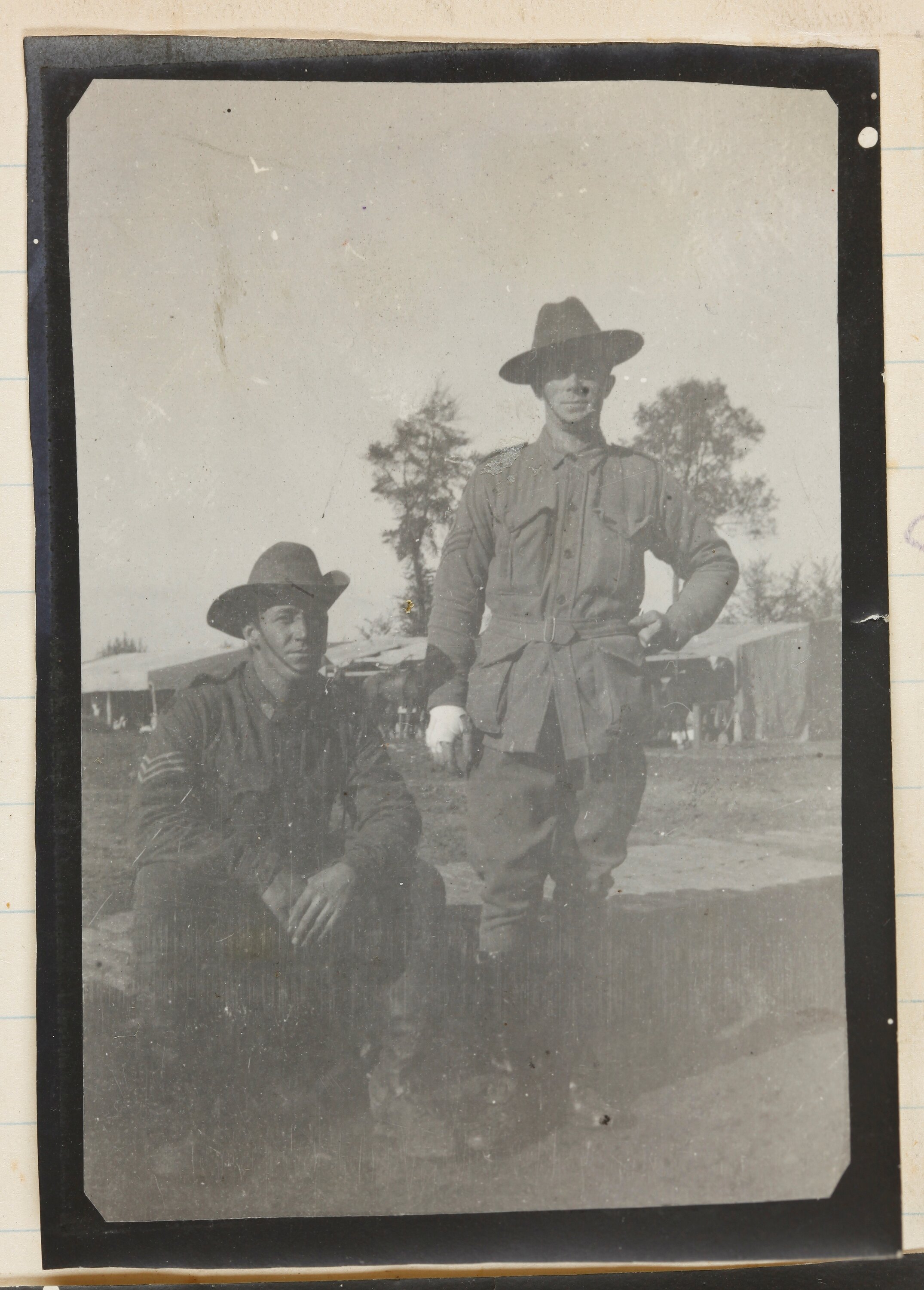 Portrait of two soldiers at an army camp in Wippenhoek. One is sitting down while the other stands beside him. The soldier standing up appears to have a bandaged right hand.
