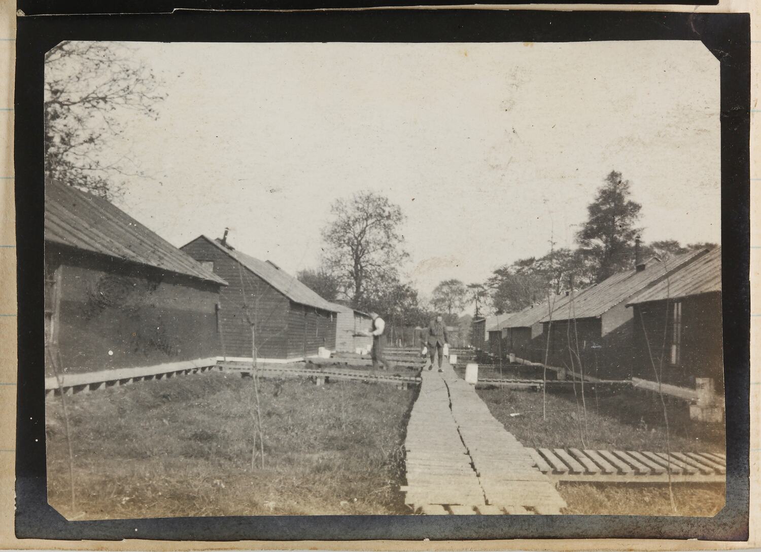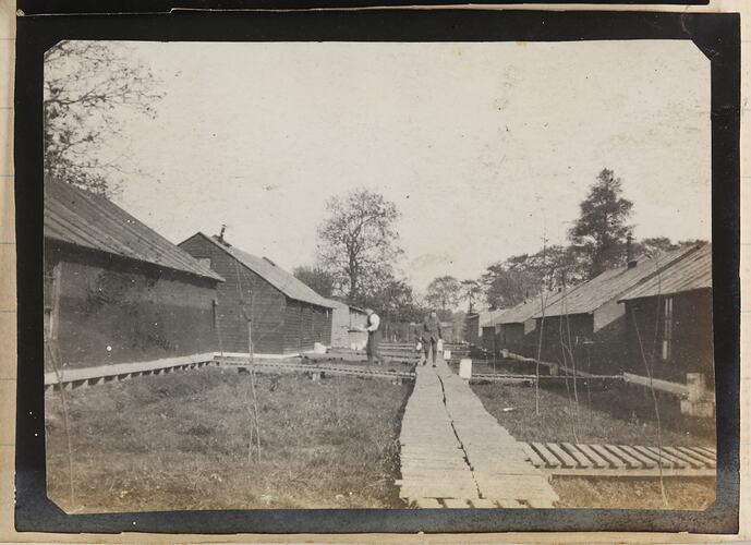 View of an army camp in Wippenhoek. Two men are walking along boardwalks that link the army huts.