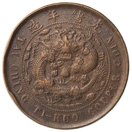 The Annual Report of the Royal Mint, London for 1906 records of the Chinese 10-cash coin that, from all Chinese mints, over 10,000 million were in circulation. Earlier strikings were of low copper content though by 1905 a 95% standard was being achieved. The coins were only worth 3 or 4 cash but were forced into circulation at the 10 cash level. The number produced and the fact that they were not recieved in payment of taxes or government revenue saw them heavily discounted in circulation. On 22 August 1905 the Emperor approved a regulation that would establish a central mint at Tientsin (now Tianjin) with four branch mints at Nanking (now Nanjing), Tientsin, Wuchang and Canton (now Guangzhou). Expansion of all other mints was forbidden with an intention to close them when possible. The official banks were to watch money-changers and markets, with any attempt to raise or lower the value of the coins to be reported to the Board of Revenue or Provincial authorities. Reference: Royal Mint Annual Report 1906, pp.26-28 This piece is issued by the Board of Revenue after 1906 but the mint name is worn.