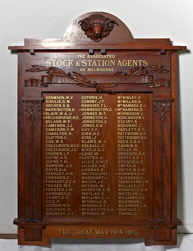 Honour board of polished wood. The board is rectangular, with a semi-circular curved top. At the top of the board, on the curved panel is a 3-dimensional carved ram's head. Written in gold lettering at the top of the board, below the ram's head, is the company name: 'THE ASSOCIATED STOCK & STATION AGENTS OF MELBOURNE'. Below this text is a carved scroll with the words 'ROLL OF HONOUR', and this is overlaid with two carved Art Nouveau-style gum leaf sprays that cross in the centre of the scroll. These carved elements appear to be discretely nailed onto the board. A large wooden panel in the centre of the board bears 90 names of men linked to the Associated Stock and Station Agents, organised in three columns in alphabetical order, and written in gold lettering. Twelve names have an asterisk, which denotes that they were killed in action or died of wounds. The bottom frame of the board bears the words in gold lettering: 'THE GREAT WAR 1914-1918'. The sides of the board are framed by two columns with a carved triple leaf design (possibly an arum lily leaf) at the top that connects by a simple carved vine to a decorative twist at the bottom. A small piece of the decorative twist appears to be missing from the right-hand column. From the back, it appears that the panel of names can slide out by removing a piece of frame that holds it in place. There is no indication of a maker's or manufacturer's mark on the board.