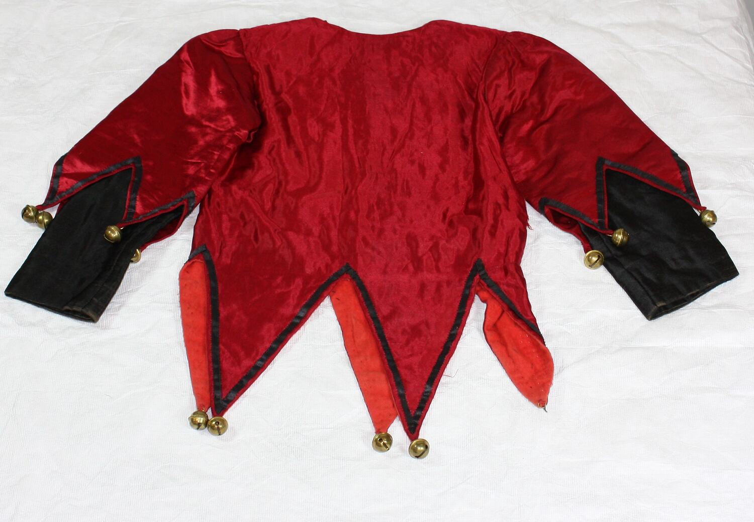 The top is bright red silk, lined with red fabric. The waist and sleeves end in points, each trimmed with hand-sewn black tape and decorated with a brass bell (one is now missing from the hem). The sleeves terminate in black silk, extending from under the pointed ends of the sleeves. The top has an opening from its round neckline, down the proper right side to under the right arm, secured with black hooks and sewn eyeholes.