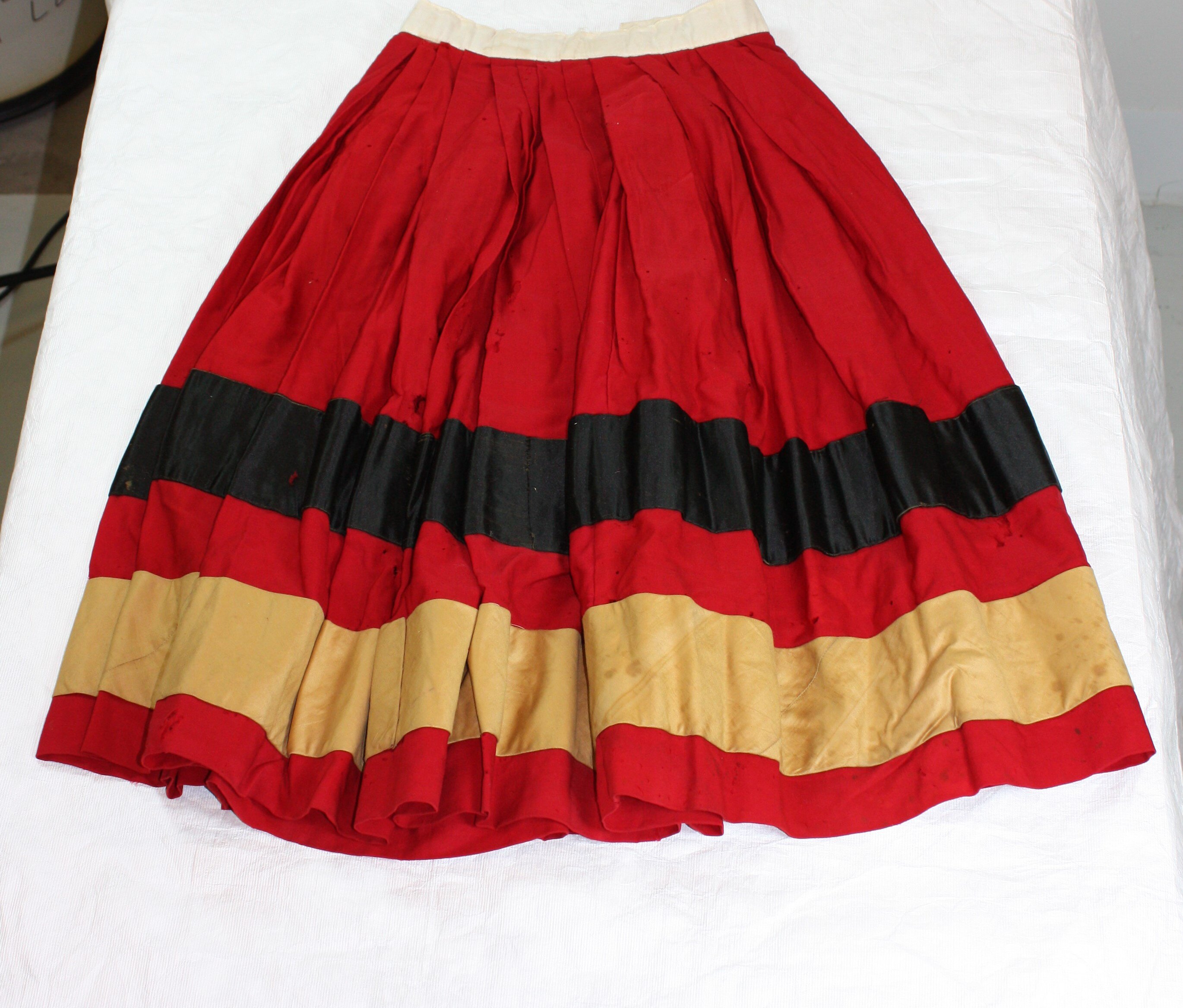 The skirt is made of heavily-gathered red fabric, with a wide black silk stripe above a wide cream silk stripe (now very discoloured), hand-sewn with running stitch. It has a narrow white waistband (calico or similar) with two hook fasteners, and is unlined. The red fabric is peppered with irregular holes - apparently moth-eaten.