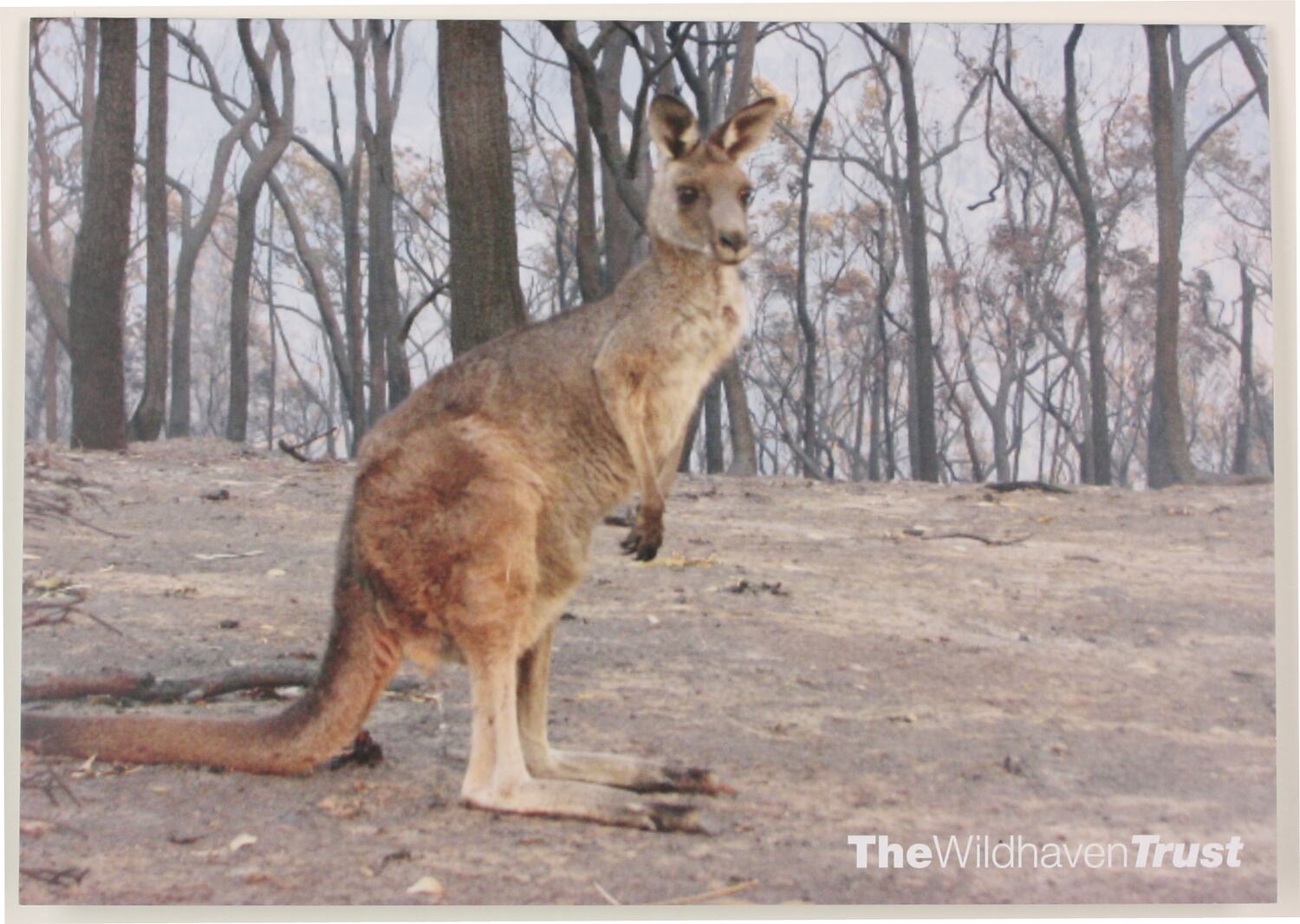 Folded gift card with colour image of a kangaroo against background of burnt trees and bare earth.
