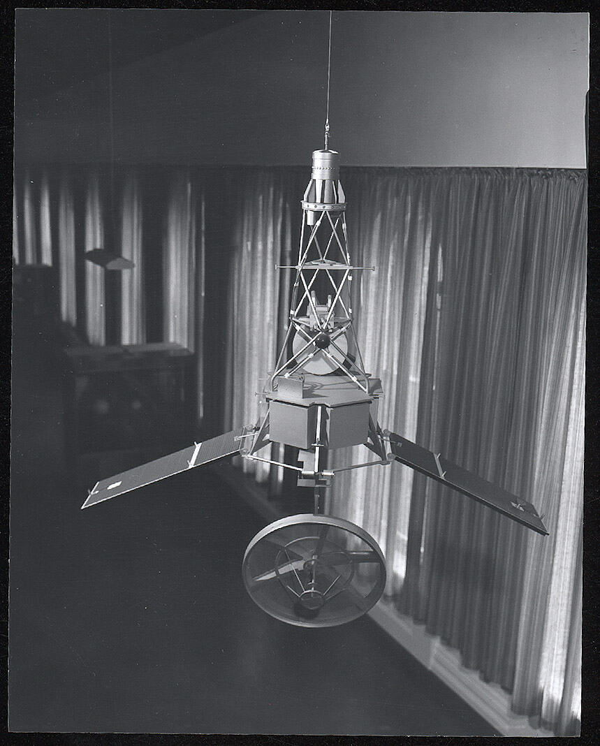 Image of a model of the NASA Mariner 2 space probe hanging in a gallery at the Science Museum of Victoria (later Museums Victoria) circa 1970.