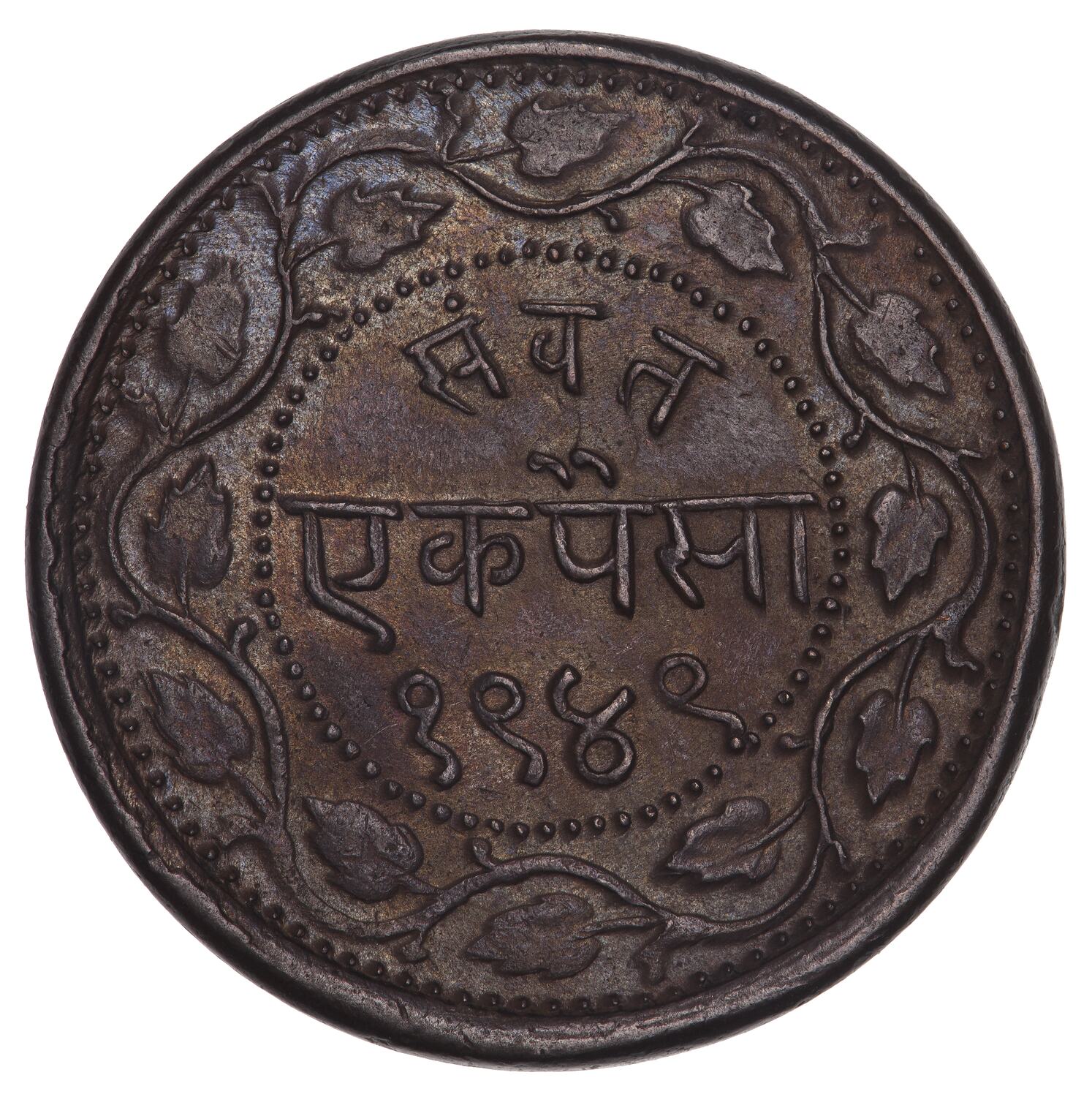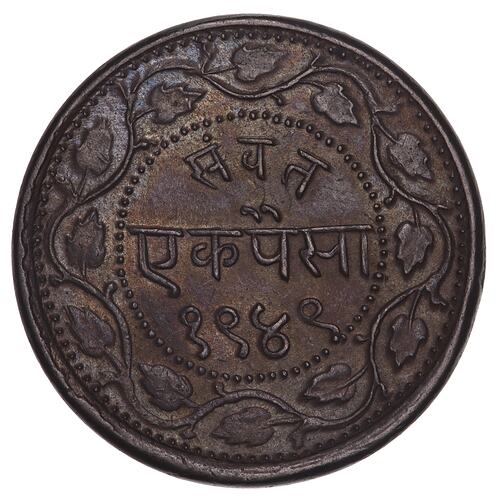 Copper 1 Paisa coin issued by the Gaekwad Maharaja of Baroda, Sayaji Rao III