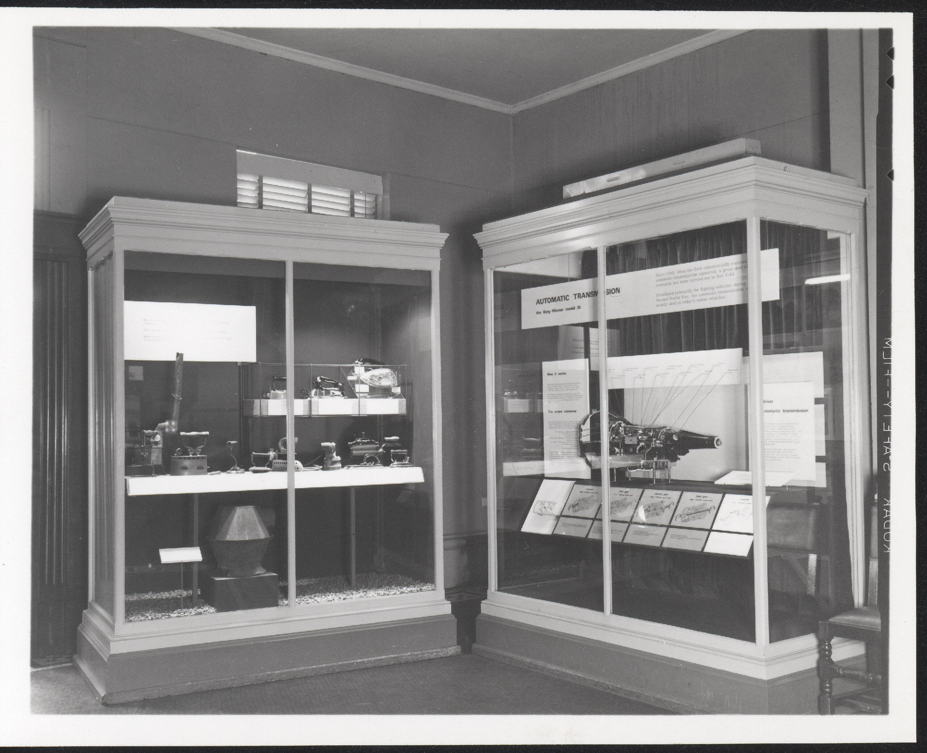 Two exhibition display cases. The case on the left is displaying domestic clothing irons and the one on the right is displaying an automatic transmission system.