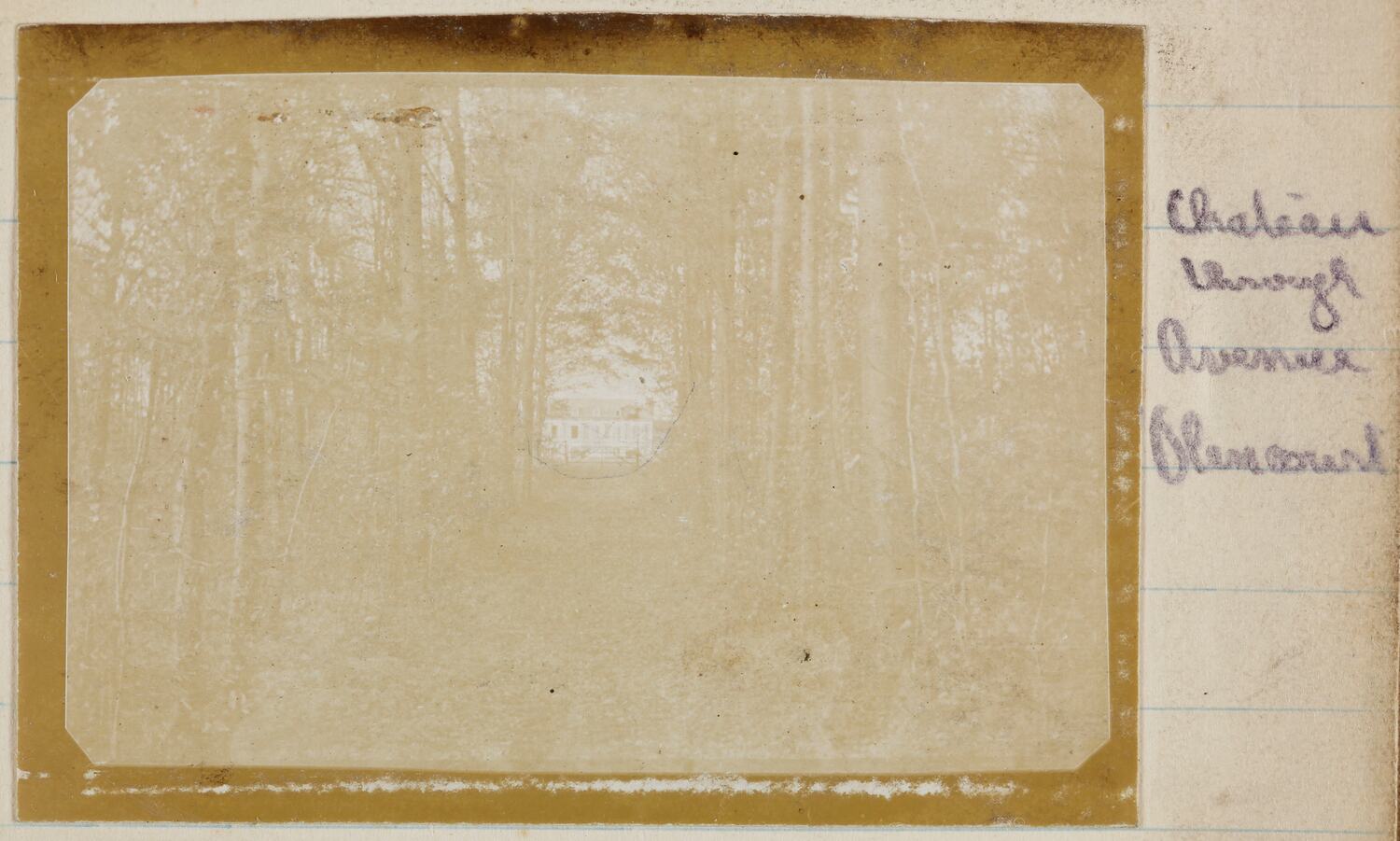 Hand written in grey pencil to the left of the photograph on the album page; '637' Hand written in grey pencil to the right of the photograph on the album page; 'Chateau / through / Avenue / Olincourt[?]'