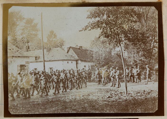 These photographs provide a record of some of the objects and places that John Lord saw in Belgium and France and the places that interested him most. These include Army camps, Chateau, trains, a plane, local people, other soldiers, horses and trucks. From the list of Lord's subjects, we can see that these photographs were taken in 'time off' that is to say, taking photographs took some time and these images depict people and places removed from battle, for example, soldiers photographed beside a Chatéau.
