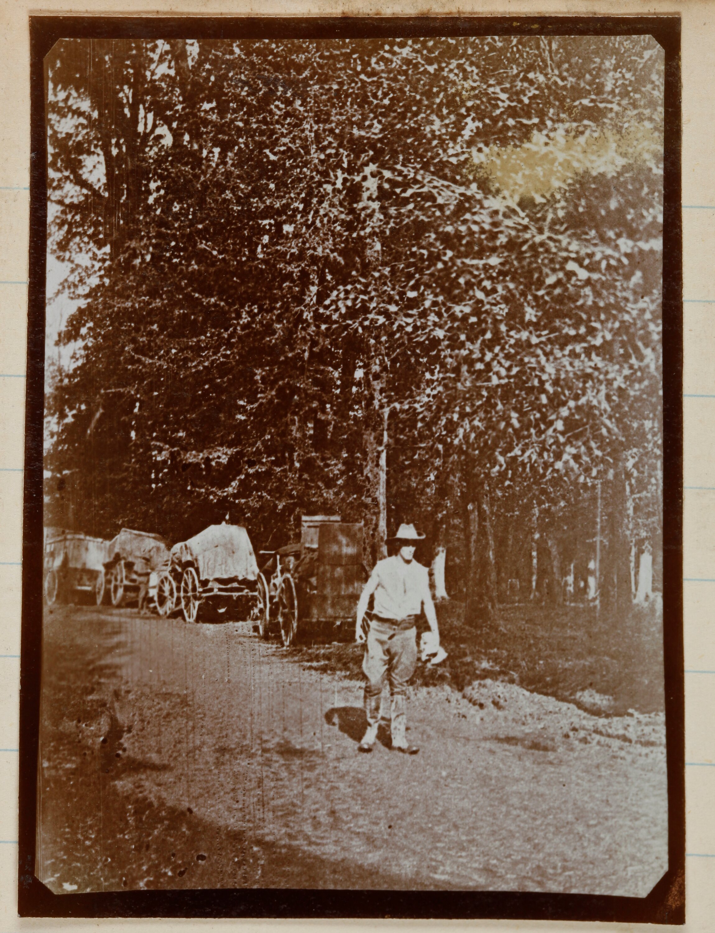 These photographs provide a record of some of the objects and places that John Lord saw in Belgium and France and the places that interested him most. These include Army camps, Chateau, trains, a plane, local people, other soldiers, horses and trucks. From the list of Lord's subjects, we can see that these photographs were taken in 'time off' that is to say, taking photographs took some time and these images depict people and places removed from battle, for example, soldiers photographed beside a Chatéau.