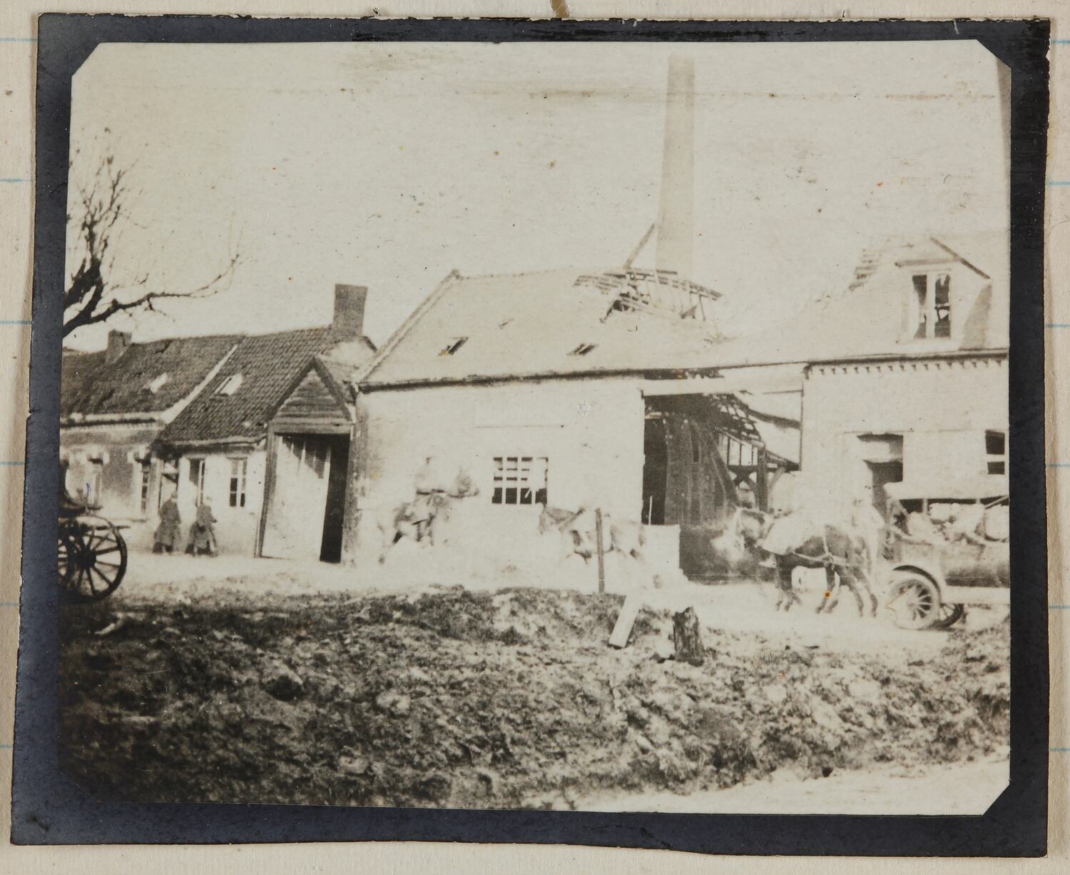 These photographs provide a record of some of the objects and places that John Lord saw in Belgium and France and the places that interested him most. These include Army camps, Chateau, trains, a plane, local people, other soldiers, horses and trucks. From the list of Lord's subjects, we can see that these photographs were taken in 'time off' that is to say, taking photographs took some time and these images depict people and places removed from battle, for example, soldiers photographed beside a Chatéau.