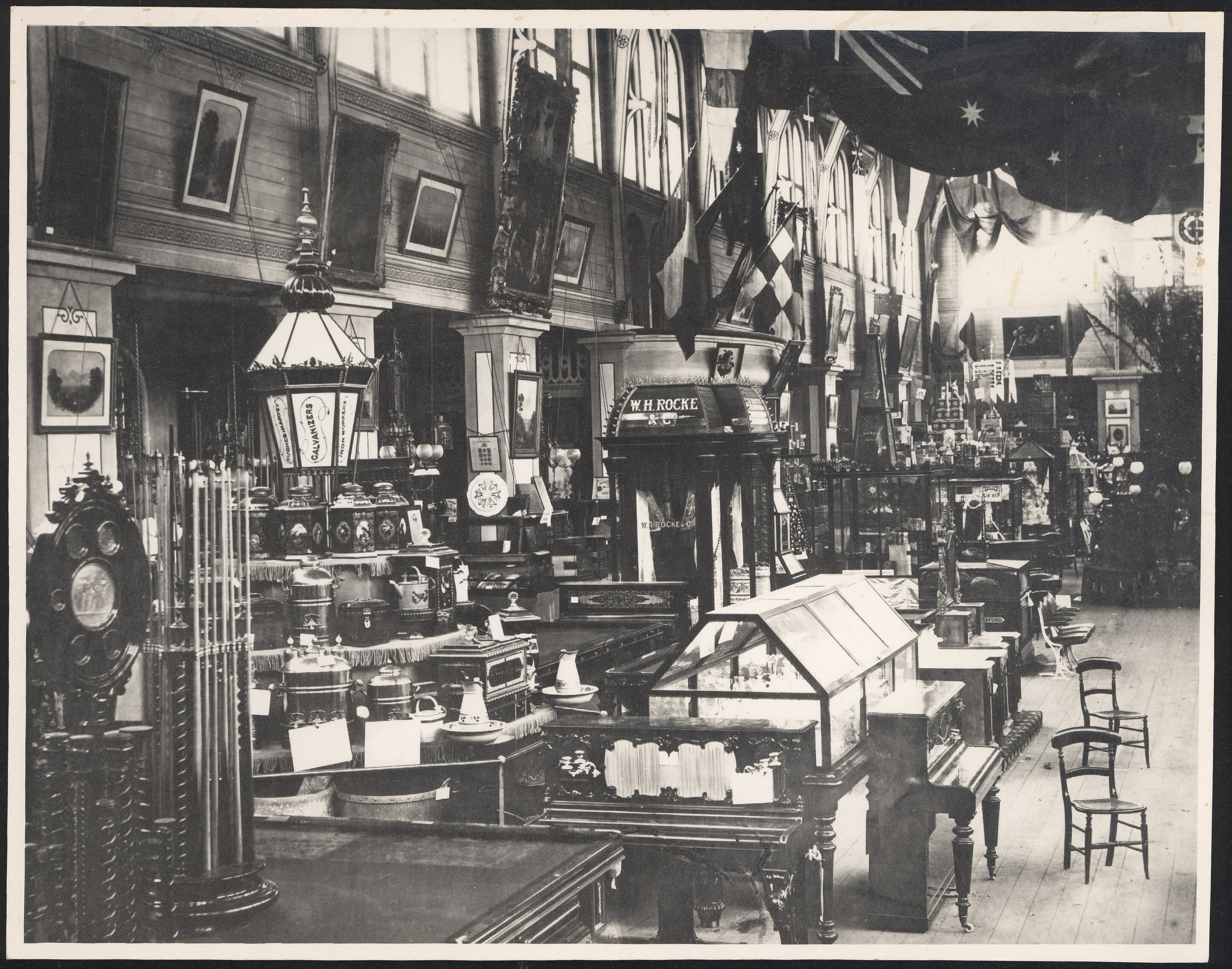 Interior view of the Royal Exhibition Building showing a large display of furniture imported by W.H. Rocke.