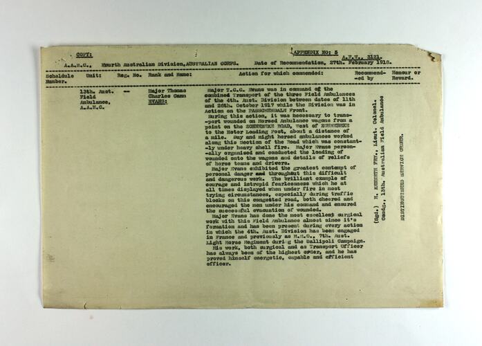 Although dated February 27, 1918 the recommendations for a Companion of the Distinguished Order and two Meritorious Service Medals actually relate to the period between the First and Second Battles of Passchendaele (October 11-26, 1917). Major Thomas Charles Cann Evans (N/A), Private Robert John Johnsson (7963) and Sergeant Arnold Doyle Kemp (170 A) were recommended for decoration due to their work at the Advanced Dressing Station during that period.