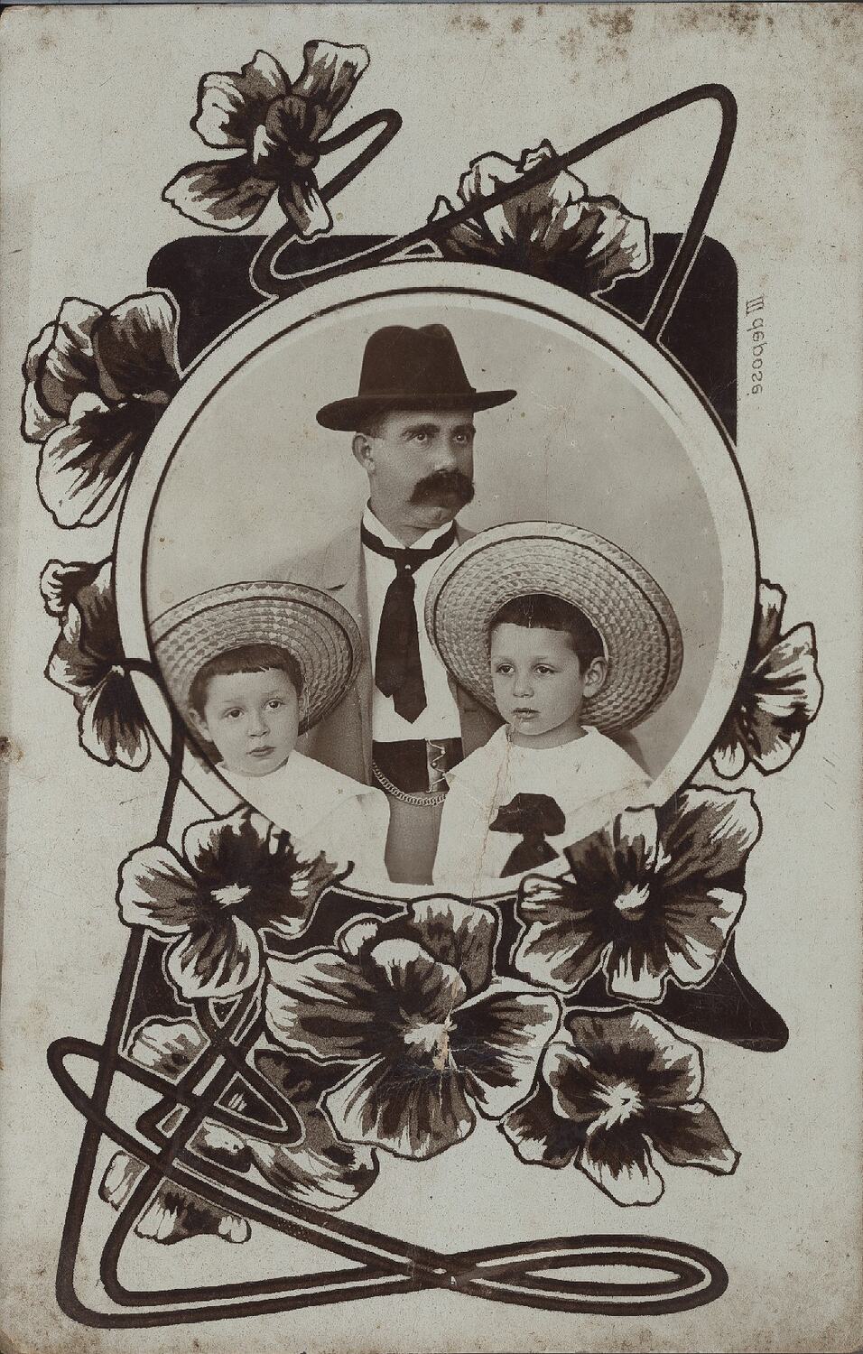 Black and white photograph printed on a postcard. The photograph depicts Leo Sterne as a young boy, with his father and younger brother. The photograph is circular, with a floral design printed as a border.
