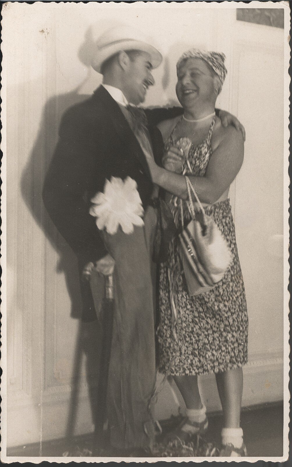 Black and white photograph of Leo Sterne and friend in fancy dress.