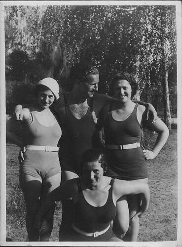 Hilda and Leo Sterne with Hilda's sisters. They are dressed in bathing suits, posing for a photograph in front of trees. Leo is standing in the centre looking at Hilda. One of Hilda's sisters stands beside him and the other is kneeling in front of him.
