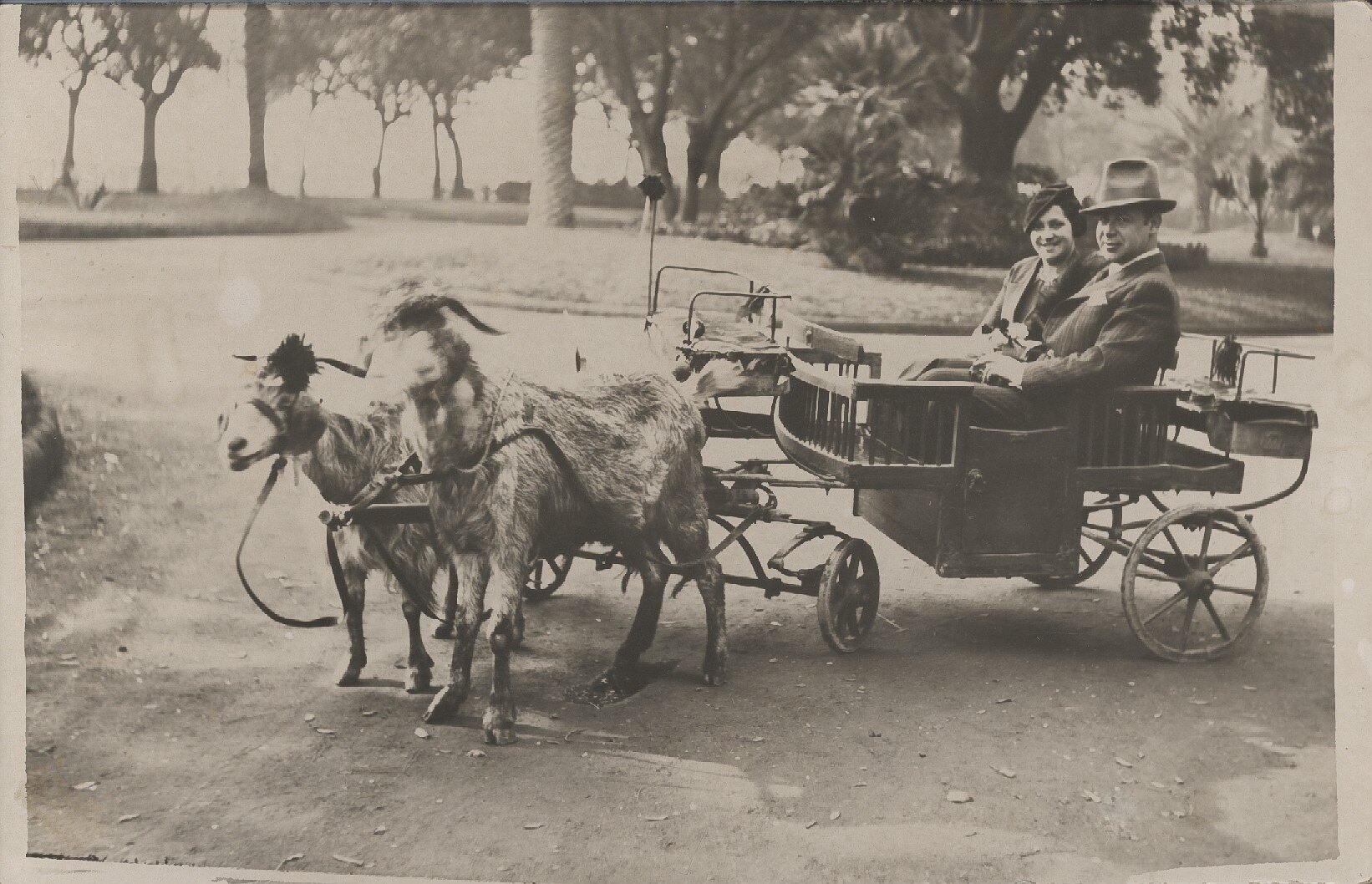 Leo and Hilda Sterne sitting in a small carriage harnessed to two adult goats in a park setting.