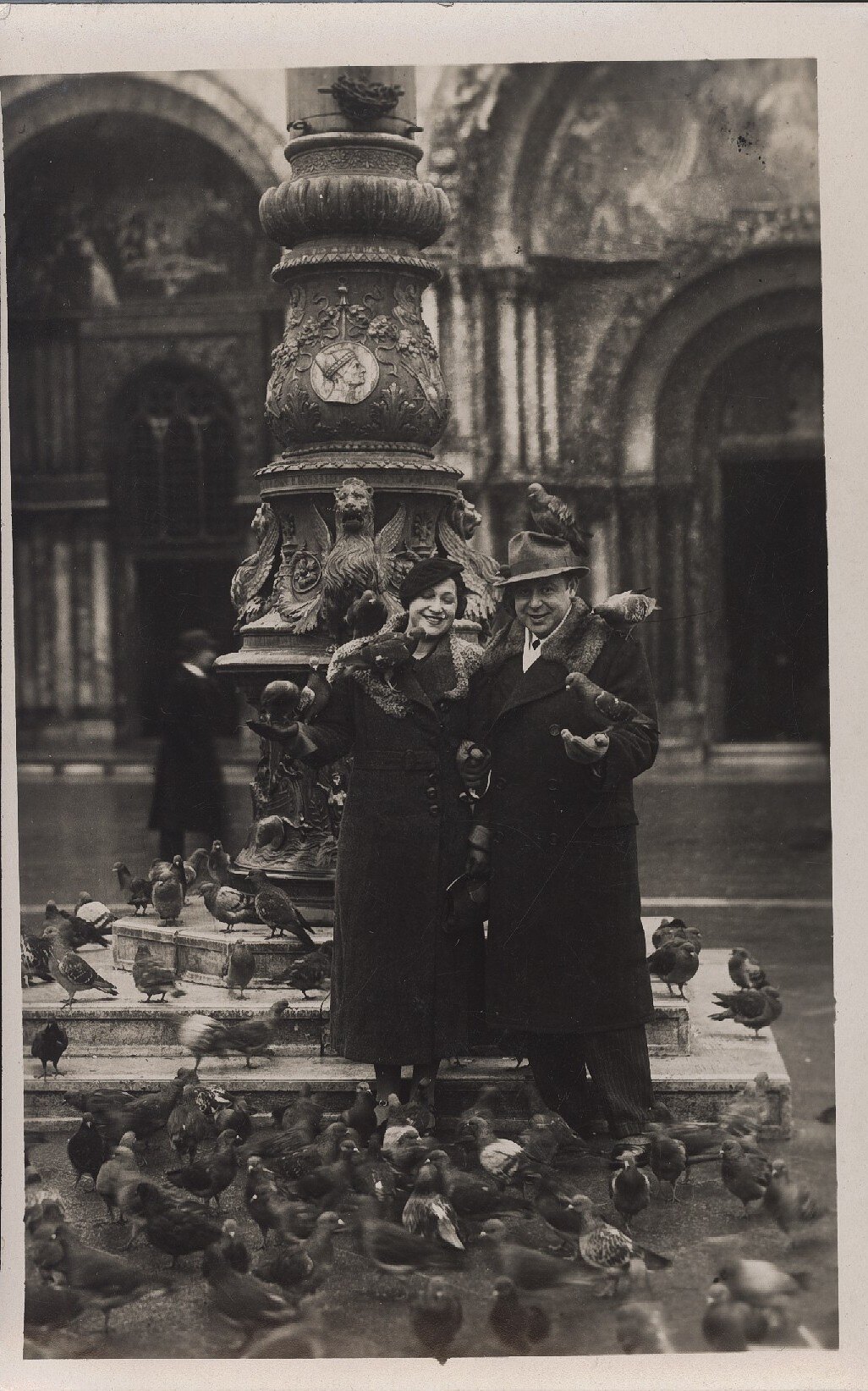 Hilda and Leo Sterne in the Piazza San Marco. The Patriarchal Cathedral Basilica of Saint Mark (commonly known as Saint Mark's Basilica) is in the back ground, and the pair, dressed in coats and hats, are surrounded by pigeons.