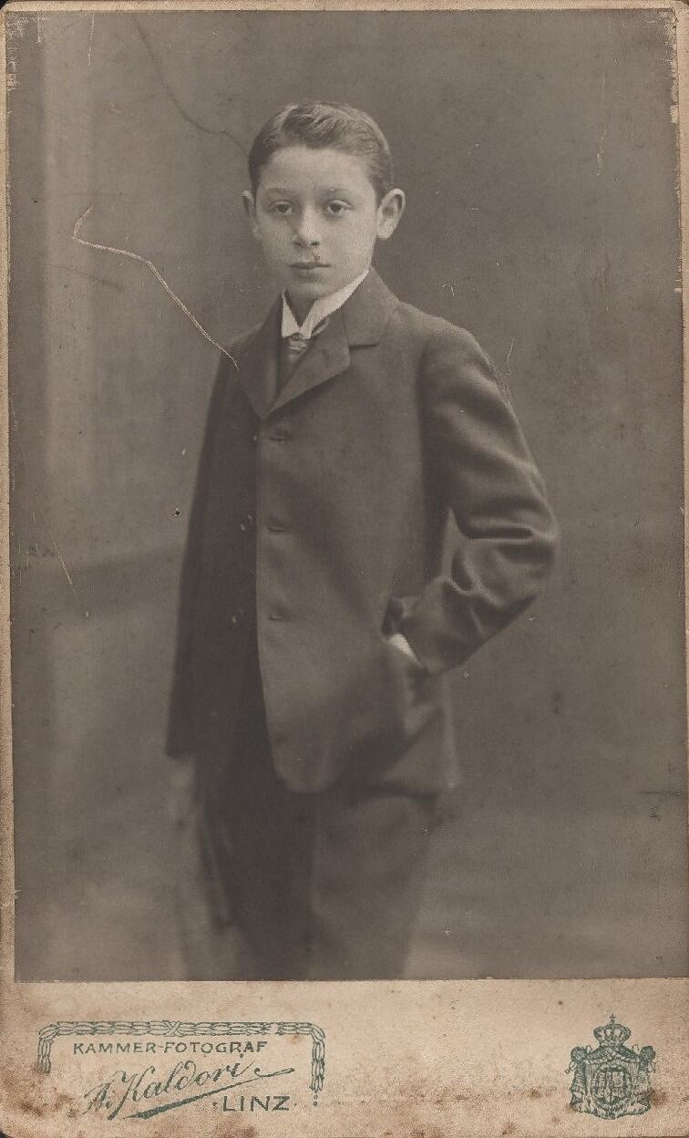 Studio portrait of Leo Sterne as a boy dressed in formal attire. Taken in Linz Austria by A. Kaldori
