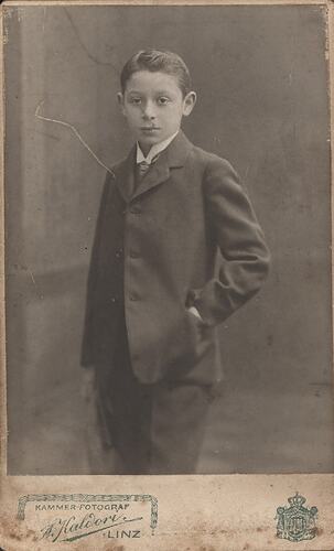 Carte de Visite in black and white depicting a studio portrait of Leo Sterne as a boy. Taken in Linz Austria by A. Kaldori, circa 1912. This photograph relates to the lives of Leo and Hilda Sterne prior to their migration to Australia from Linz, Austria in 1939, joining other family members who had arrived in 1938. The Sternes (originally Sternschein), listed as 'stateless', were probably refugees accepted as part of the Australian Government's Jewish quota intake just prior to World War II. The Stern's went on to found the successful L. J. Sterne Doll Company. Leo Sterne is recorded as having enlisted in the Citizen's Military Forces during World War II and in 1944 he was naturalised.