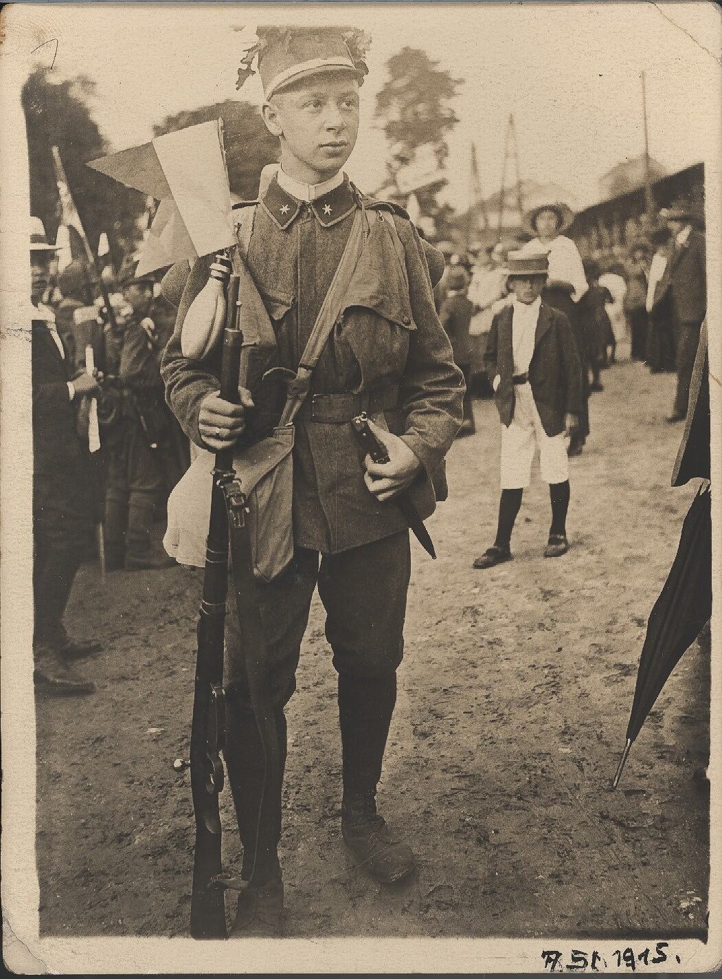 The photograph depicts Leo Sterne as a sixteen year old dressed in military uniform which includes hat, coat, pants and boots. Also includes a satchel, gun with a flag and a small dagger. It has been taken outside at a rally or festival.