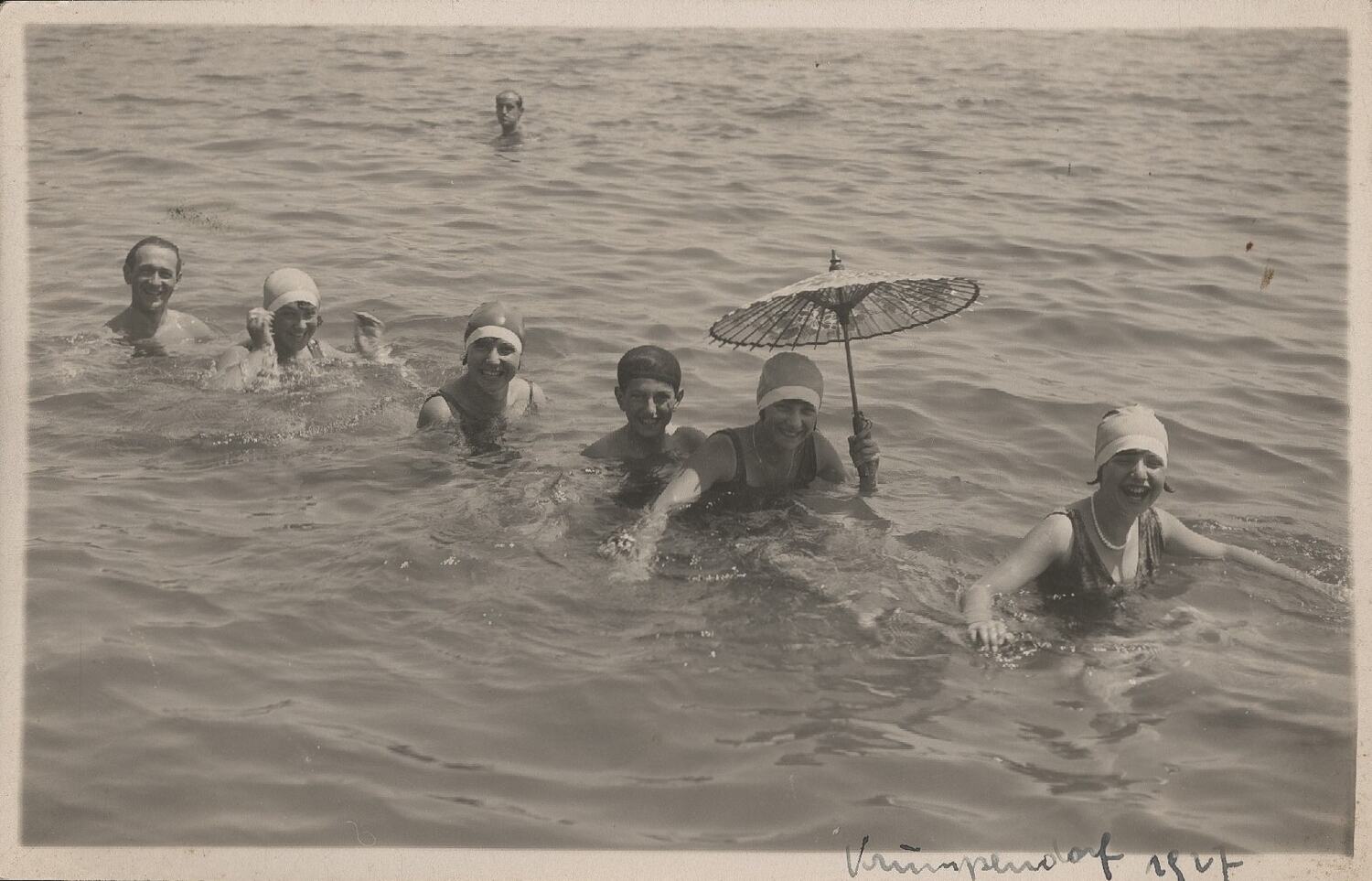 Black and white photograph printed on a postcard. Group of people swimming in the ocean most likely in Europe (possibly Austria).