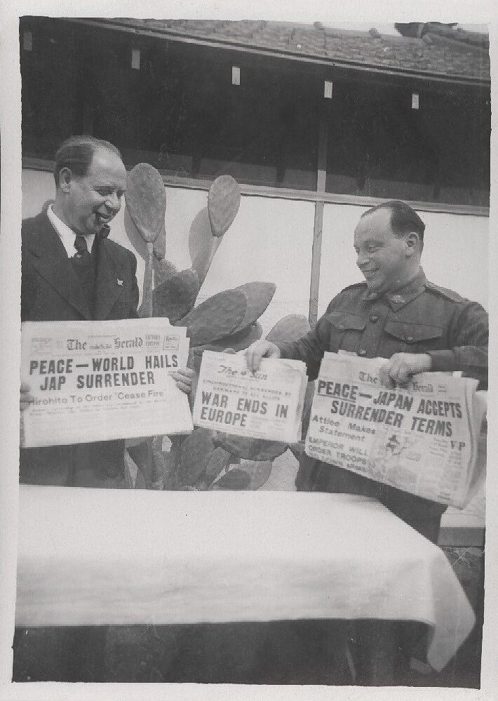 Leo Sterne, on the left in the photograph, is holding up 'The Herald' newspaper with the headline 'Peace - World Hails Jap Surrender'. Another unknown man in a military uniform standing next to Leo Sterne is also holding up two newspapers. 'The Sun' newspaper heading reads ' War Ends In Europe' and the other newspaper heading reads 'Peace - Japan Accepts Surrender Terms'. There is a prickly pear plant in the background.