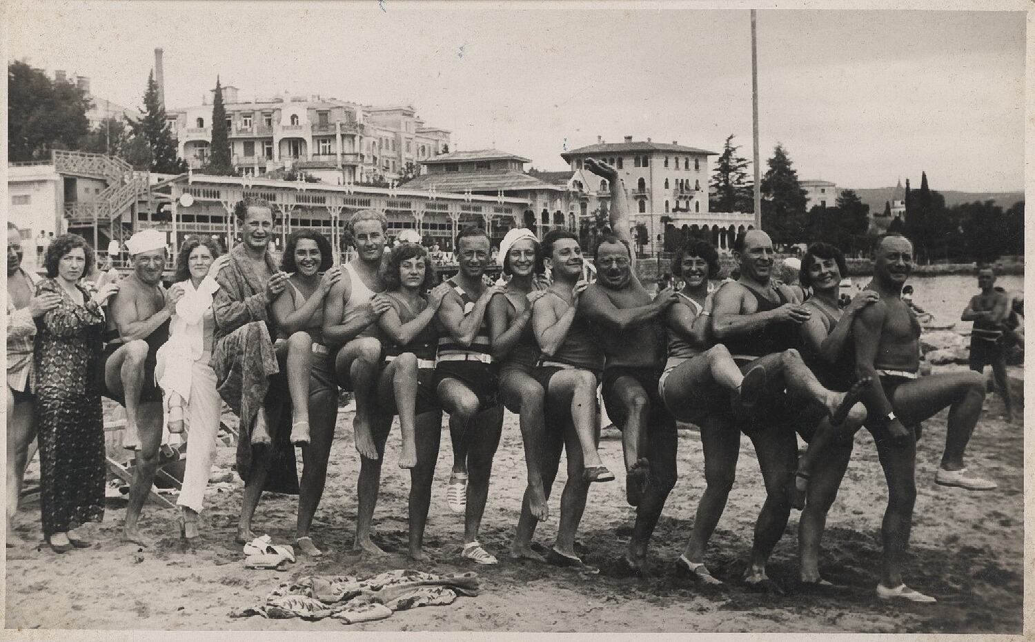 A line of people posing on the foreshore of an unknown beach. Most of the people have one leg raised in the air.