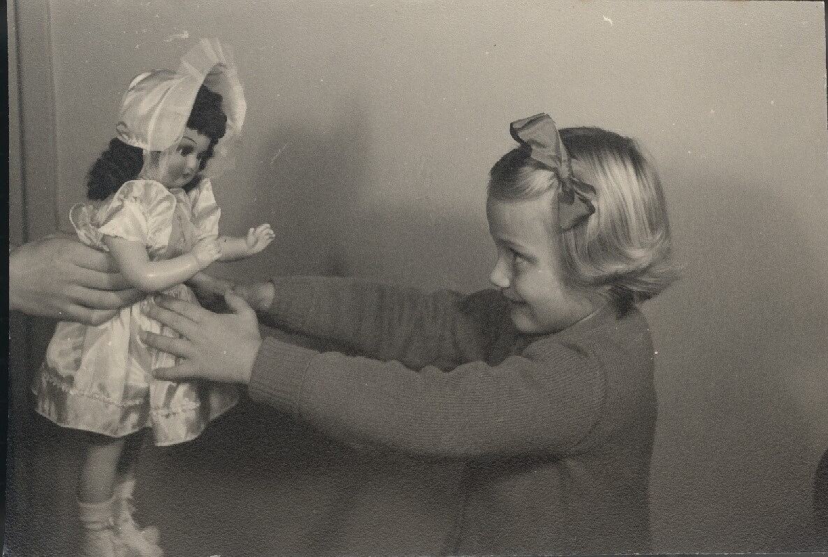 Black and white photograph of a young girl accepting an L. J. Sterne doll.