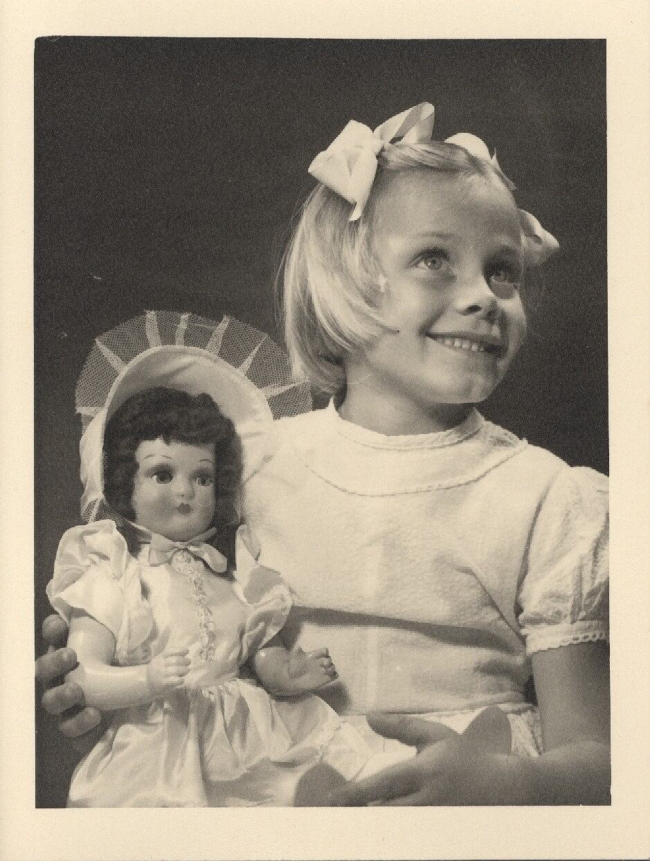 A young Caucasian girl models with a doll. The girl is wearing a short-sleeved white dress, and has two white bows in her hair. She is smiling and not looking at the camera. The doll has pale skin and dark hair, and is wearing a dress, stockings, shoes and bonnet, entirely in white. The bonnet has a lace trim.