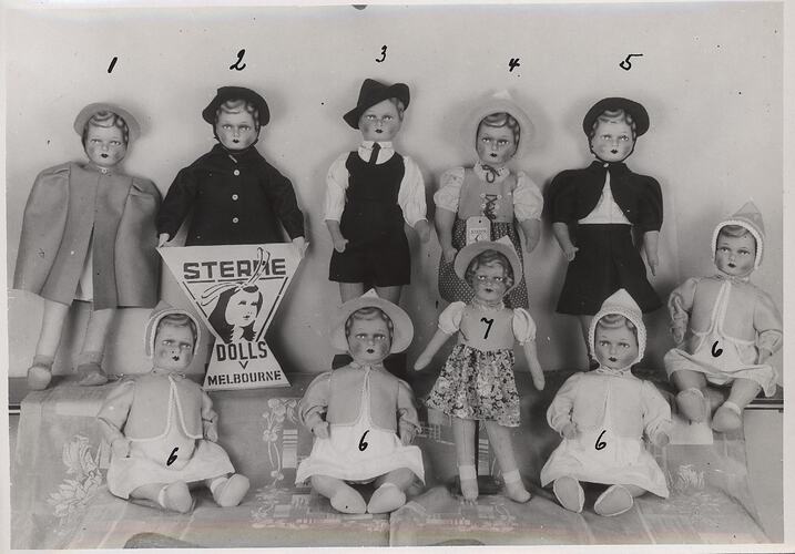 A Product display of Leo Sterne dolls consisting of 10 dolls. The dolls in the picture all possibly have their model numbers (1-7) written in blank ink above their head/on their clothing. This may have been used as a way of quickly identifying the dolls for making orders. The doll in the back row second from the left is holding a Leo Sterne Doll Co. trade sign entitled 'Sterne Dolls Melbourne. Each doll model is wearing a different dress and hat. From the back row from left in photograph:Doll model one is wearing a poncho/raincoat and hat/rain hat, Doll model two is wearing a black coat and matching black hat, Doll model three is wearing possibly a tunic/possibly shorts/possibly traditonal Austrian dress consisting of a dirndl (type of Austrian/German/Bavarian female dress) and possibly a matching tyrolean hat (type of Austrian/German/Bavarian Alpine hat), Doll model four is wearning a dirndl (type of Austrian/German/Bavarian female dress) and matching white possibly a matching tyrolean hat (type of Austrian/German/Bavarian Alipine hat), Doll model five is wearning a white blouse, black jacket and skirt and matching black hat, Doll model six is wearing a white dress, matching jacket and bonnet (there are four dolls of this model in the picture all in the front row.),Doll model seven is standing and wearning possibly a dirndl (type of traditional dress worn in Austria and Germany) and matchinhg white possibly traditional Alpine hat.All dolls are all displayed on a decorative cloth fabric and all dolls appear to be wearning matching shoes and socks. Some are displayed sitting while others are not.