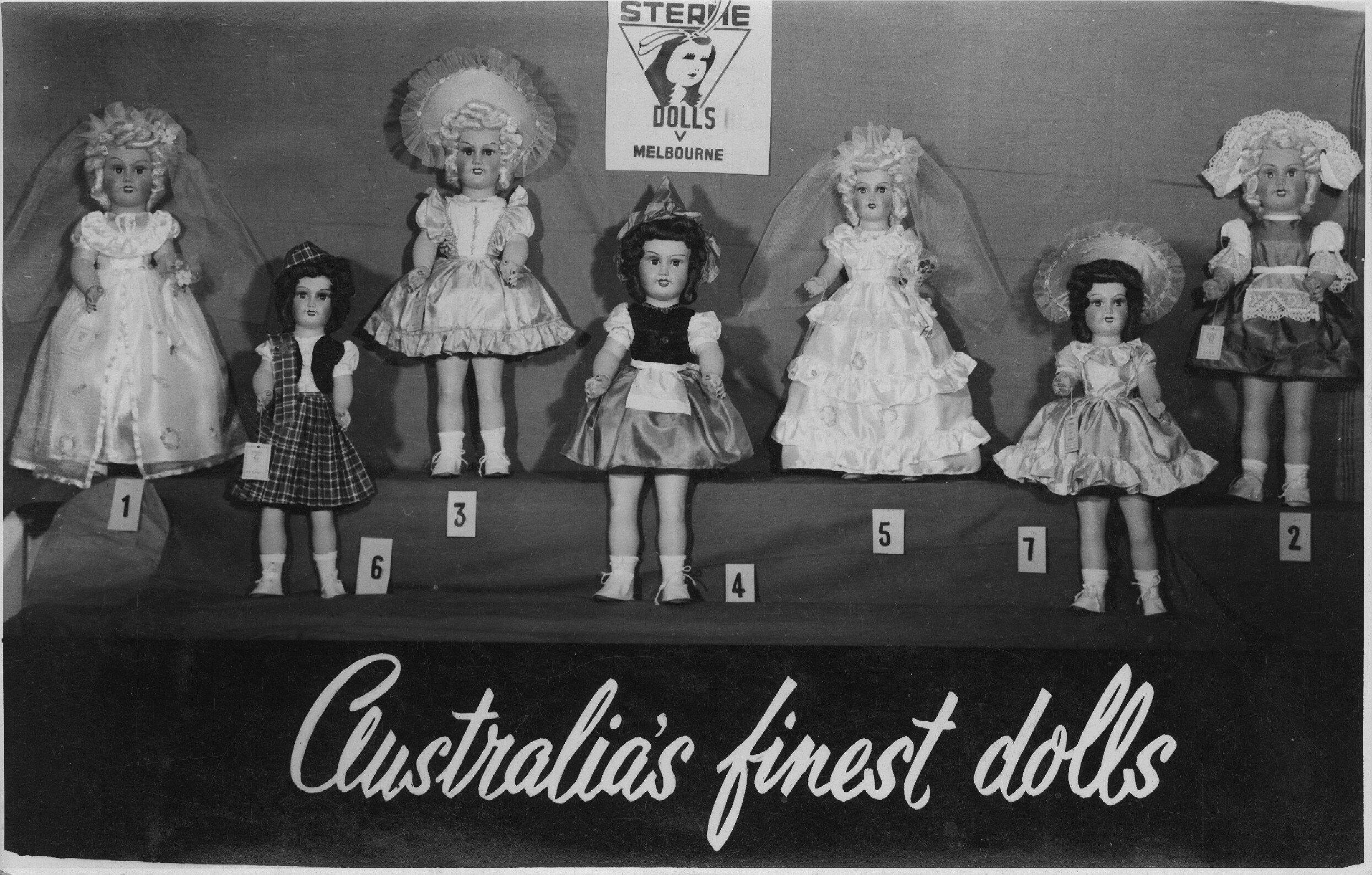Black and white photograph depicting seven female dolls on display. This photograph relates to products and promotions of the L.J. Sterne Doll Company (1939-1971), a Melbourne doll and toy manufacturer founded by Austrian migrants Leo and Hilda Sterne.