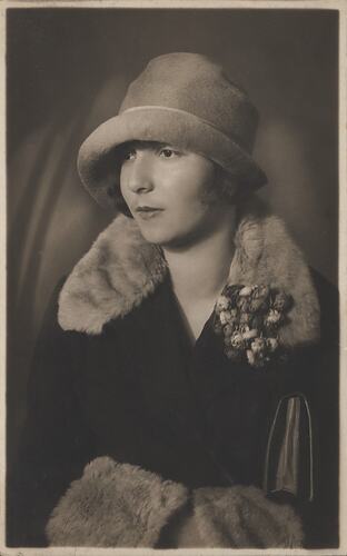 Photographic portrait of a woman dressed in coat with fur collar and sleeves trimming, wearing a hat and holding a handbag under her left arm.