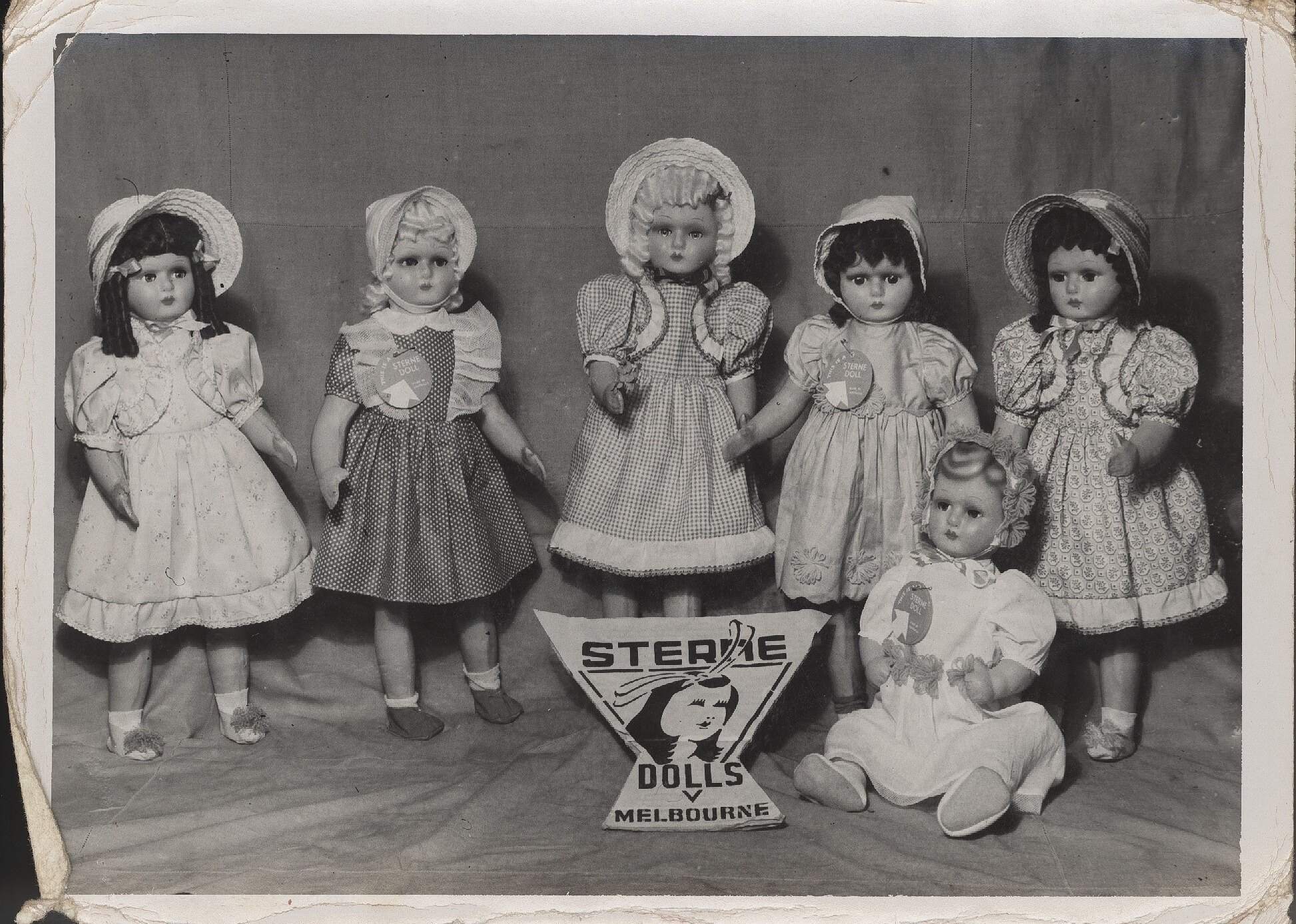 Black & White photograph of Leo Sterne Company product display of six dolls in different frilly dresses. Five of the dolls are standing and the sixth is sitting. All dolls wear bonnets or hats. The dolls are displayed on a cotton cloth sheet/blanket. The first doll is wearing a frilly white dress with puffed sleaves, matching shoes and socks and has black hair in ringlets. The second doll is wearing a frilly white spotted dress not with puffed sleaves, matching shoes and socks and has blond hair. She has a visible product tag entitled 'Sterne doll' with a white arrow pointing upwards to her face on the tag. The third doll is wearing a frilly checked dress with puffed sleaves, shoes and socks are not visible due to a company sign. At the base of the doll which reads 'Sterne Dolls Melbourne.' The four doll is wearing a frilly plain dress with puffed sleaves, left sock is visible but not right sock or shoes. She has a visible product tag entitled 'Sterne doll' with a white arrow pointing upwards to her face on the tag. The fifth doll is wearing a frilly dress with circled patterned design possibly floral in the centre of the circular pattern only her right sock and shoe is visible. The sixth doll (the only doll seated) is wearing a white dress that is not frilly and possibly only shoes the socks are not visible. She has a visible product tag entitled 'Sterne doll' with a white arrow pointing upwards to her face on the tag.