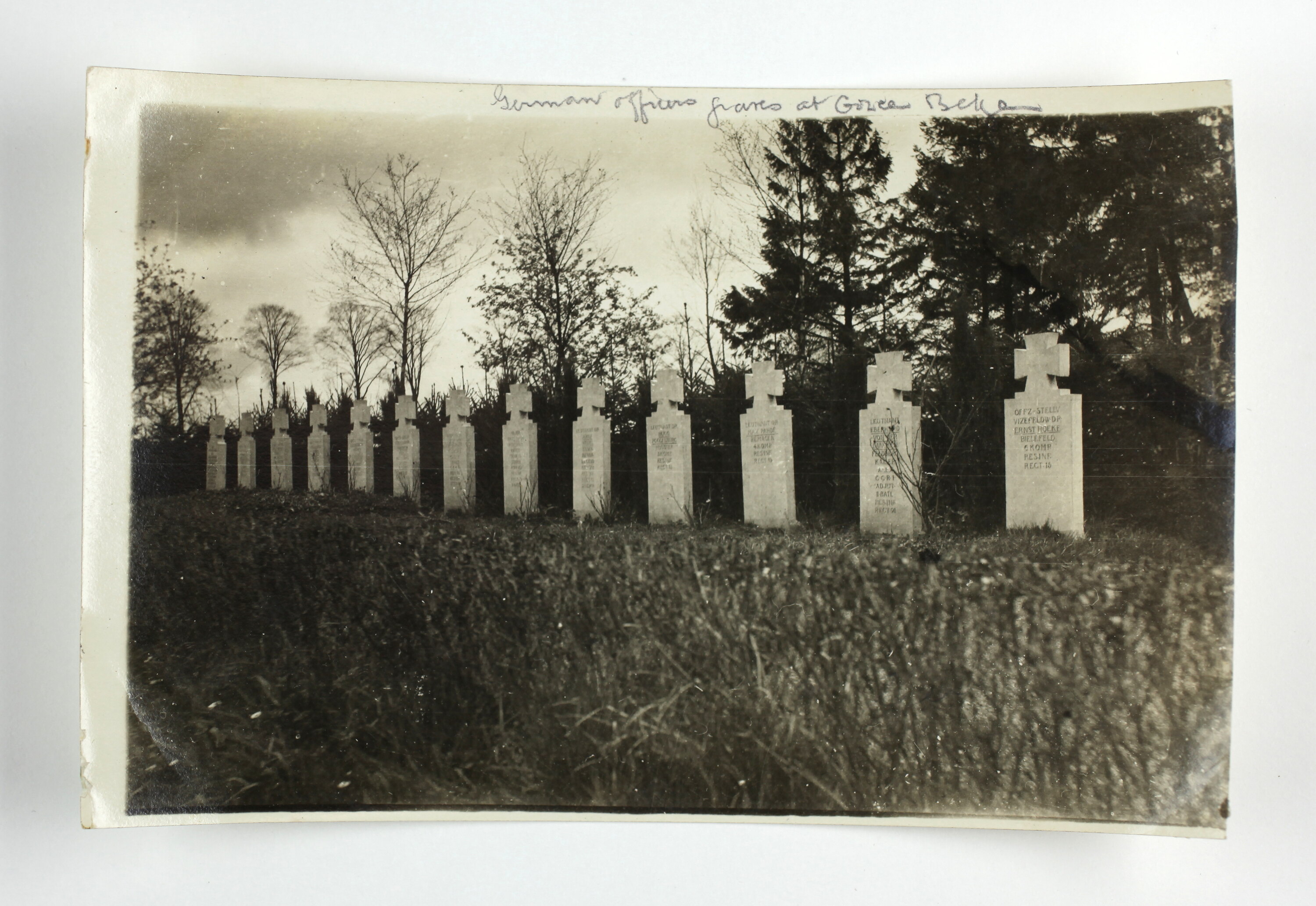 Hand written in black ink on the top of the photograph; 'German officers graves at Gozee Belgium' Hand written in grey pencil on the back of the photograph; 'Ger officers GRaves at Gozee'