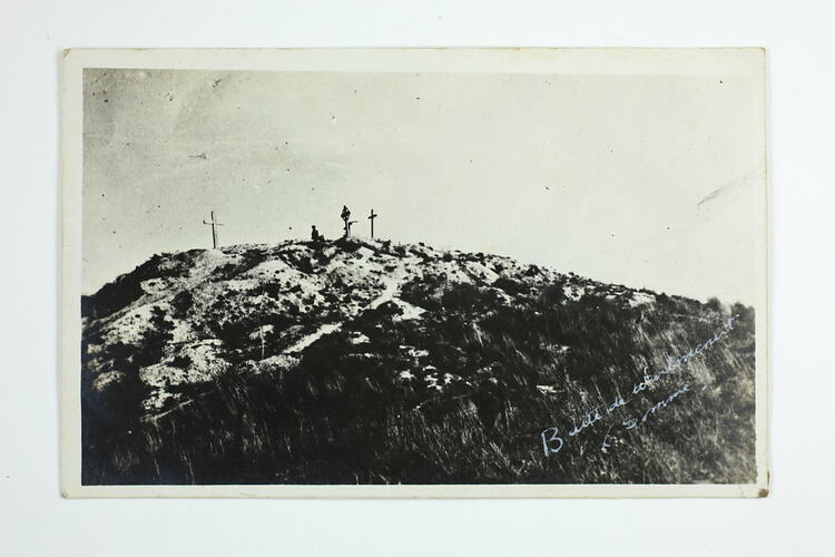 Hand written in white ink on the front of the photograph; 'Butte de Warlencourt / Somme' Hand written in grey pencil on the back of the photograph; 'Butte de Warlencourt' Hand written in grey pencil on the album page below the image; '[illeg] Butte de Warlencourt captured by / the British in the battle [illeg] Somme / July - Aug 1916.'