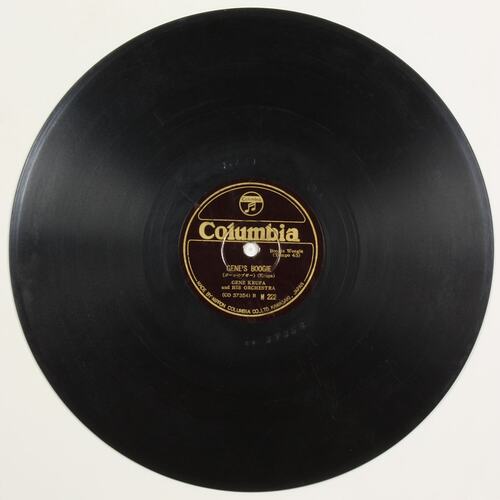 Disc recording (10 in), doubled sided, Columbia, "Drum Boogie" & "Gene's Boogie", Gene Krupa and his Orchestra, manufactured in Japan.