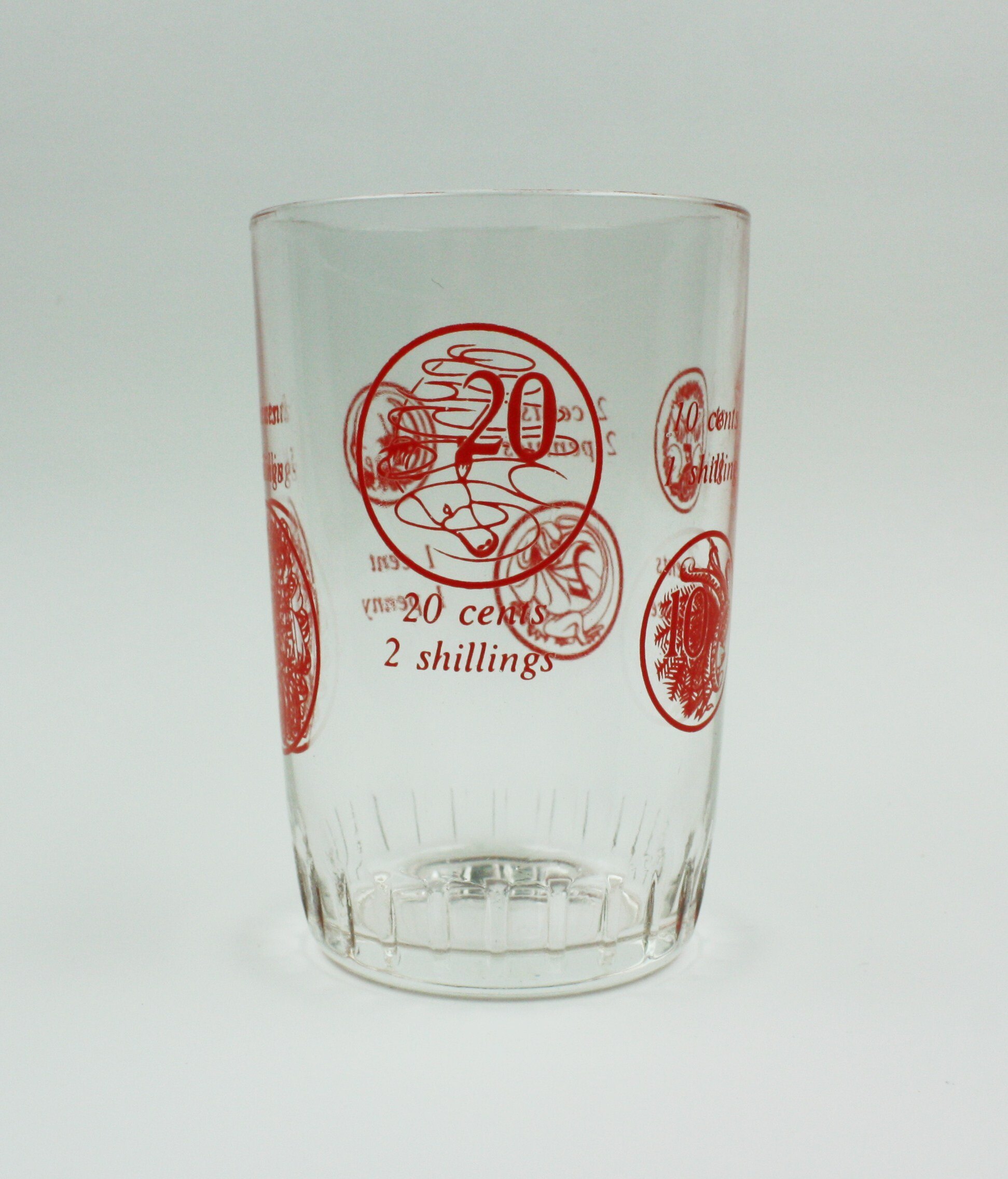 Clear glass tumbler printed in red showing decimal coin currency and equivalents in pre-decimal currency. It features images of 1, 2, 5 10, 20 and 50 cent pieces. The donor used the glass for everyday drinking.