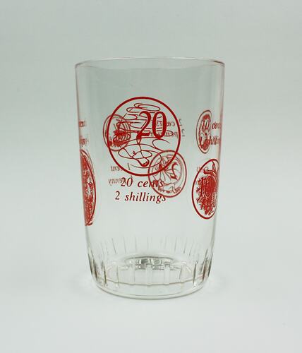 Glass tumbler printed in red with images of the new decimal currency and numerical equivalents in pre-decimal currency. It features line drawings of 1, 2, 5,10, 20 and 50 cent coins. The glass has straight sides and a slightly fluted pattern around its base.