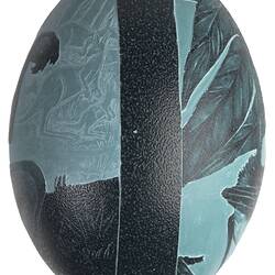 Emu egg, incised, depicting two scenes. Scene a: Foreground - boy/dancer in crouched dance position, background scene of seven kangaroos in a wooded landscape. Scene b: Foreground - willy wagtail perched on a branch with vegetation - leaves and gum nuts. The artist has etched her name at the bottom of the willy wagtail scene. Holes at top and bottom.