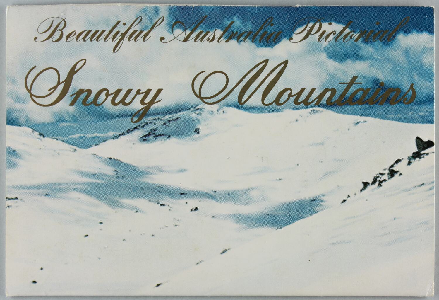 Full colour set of fold-out postcards. Gloss envelope cover with title and image of snow-covered mountain slopes on front and plain reverse side with space for postal details and stamp. Six two-sides colour postcards fold out featuring different scenes around the Snowy Mountain area.