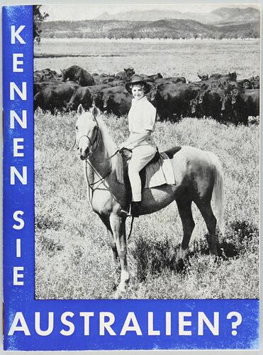 Small 64 page booklet with soft cover featuring black and white image of a woman riding a horse. Title runs around border of cover on blue background. Back cover feature black and white image of harbour at Pyrmont Sydney. Inside pages contain extensive text and a few images all printed in black and white. All text is in German.