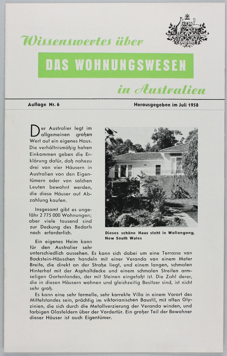 Front cover: 'Wissenswertes uber Das Wohnungswesen in Australien/July 1958'.