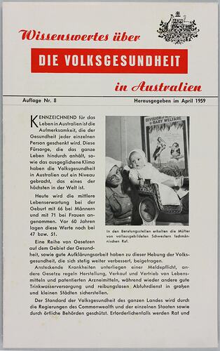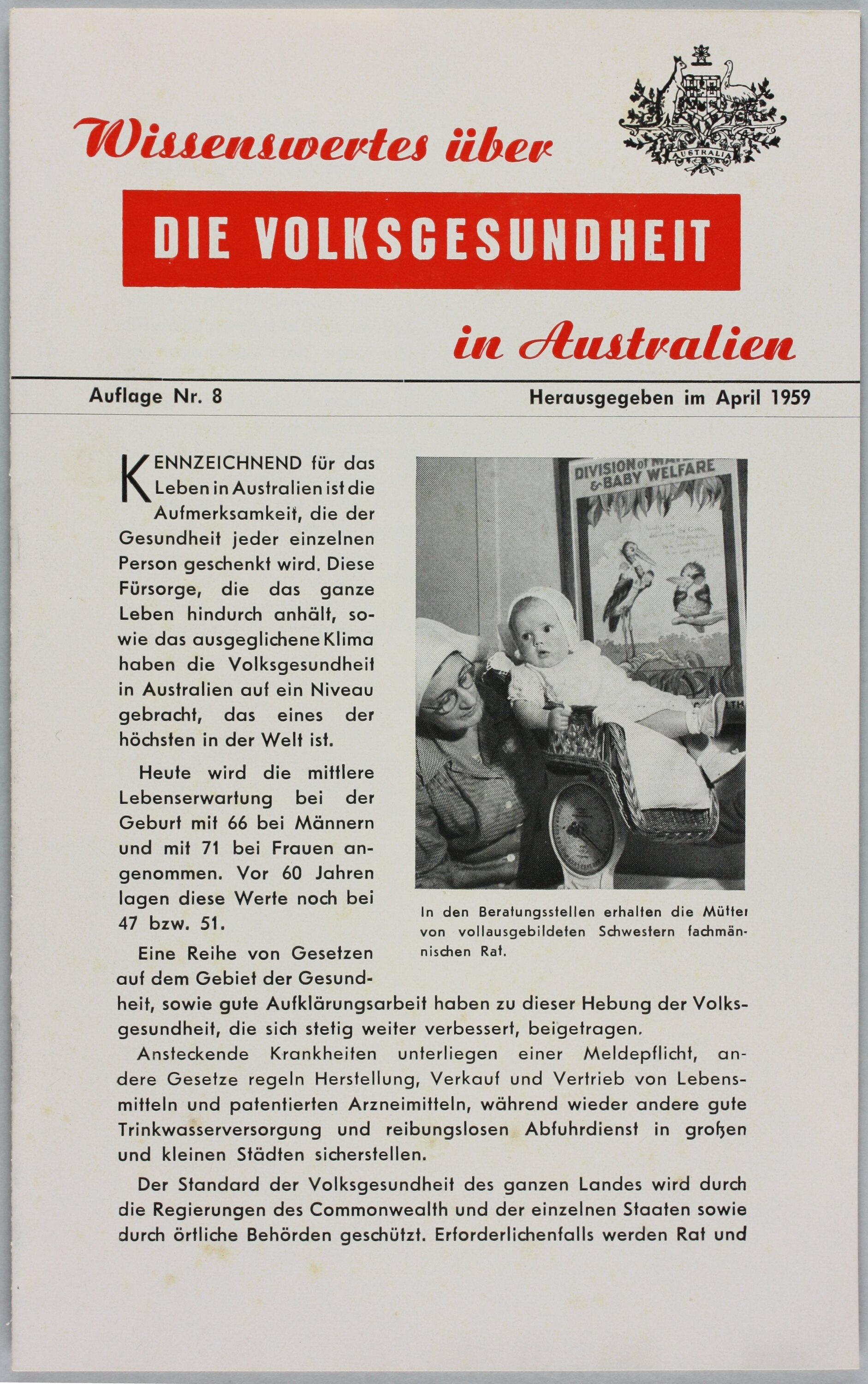White 8 page booklet including cover, text printed in black ink. 2 staples at spine. Front cover features text, image of a nurse weighing a baby and the title is printed white on red background. The Australian coat of arms is in the top right hand corner. All text is in German.