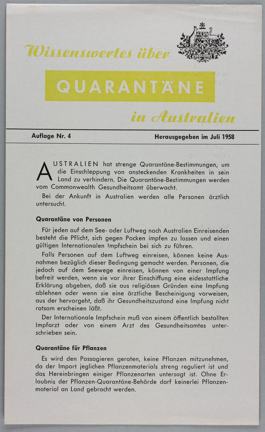 Front cover: 'Wissenswertes uber Quarantane in Australien/Juli 1958'