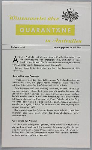 Flyer entitled 'Wissenswertes uber Quarantane in Australien' ['Facts About Quarantine in Australia'], issued in German by the Australian Department of Immigration in July 1958. It was issued to Dorothea Huber [nee Freitag and later Dunzinger] in preparation for her migrant voyage from Austria to Melbourne onboard the Cogedar Line ship 'Flaminia' in November 1959.