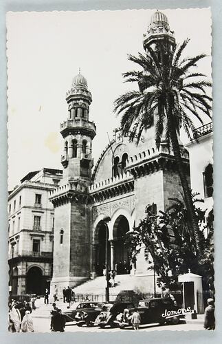 Black and white postcard featuring image of a cathedral on a street with a palm tree in the foreground. The postcard was collected during the voyage on the British Ministry of Transport's S.S. 'New Australia' by Stanley and Lucy Hathaway and was amongst many personal items brought to Australia when the Hathaway family migrated from England in 1951.